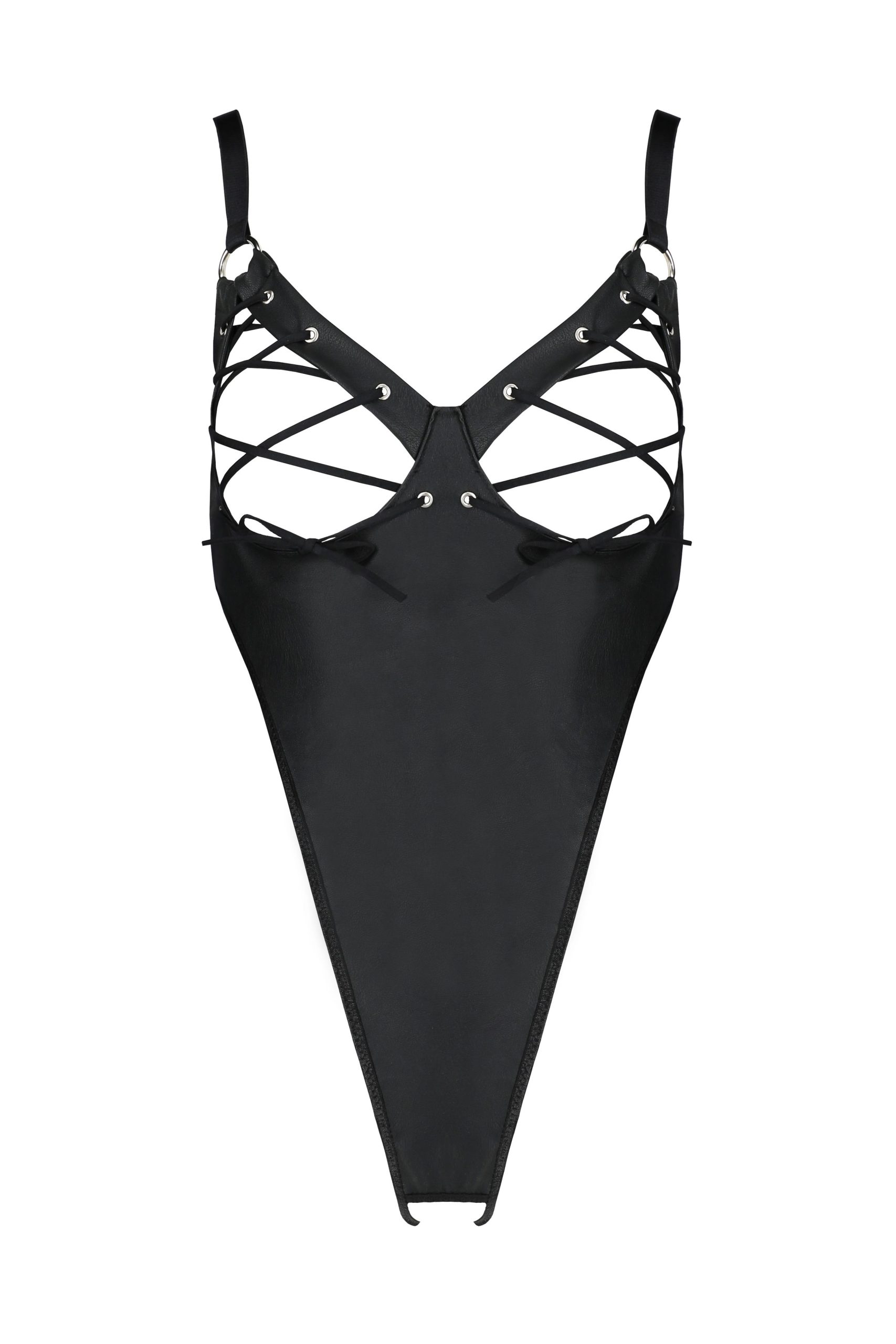 Корпус от имитация на кожа с отворени чашки и детайли презрамки. Твърд и игрив. С отворен чатал и капси в сребрист цвят. Презрамките се регулират.