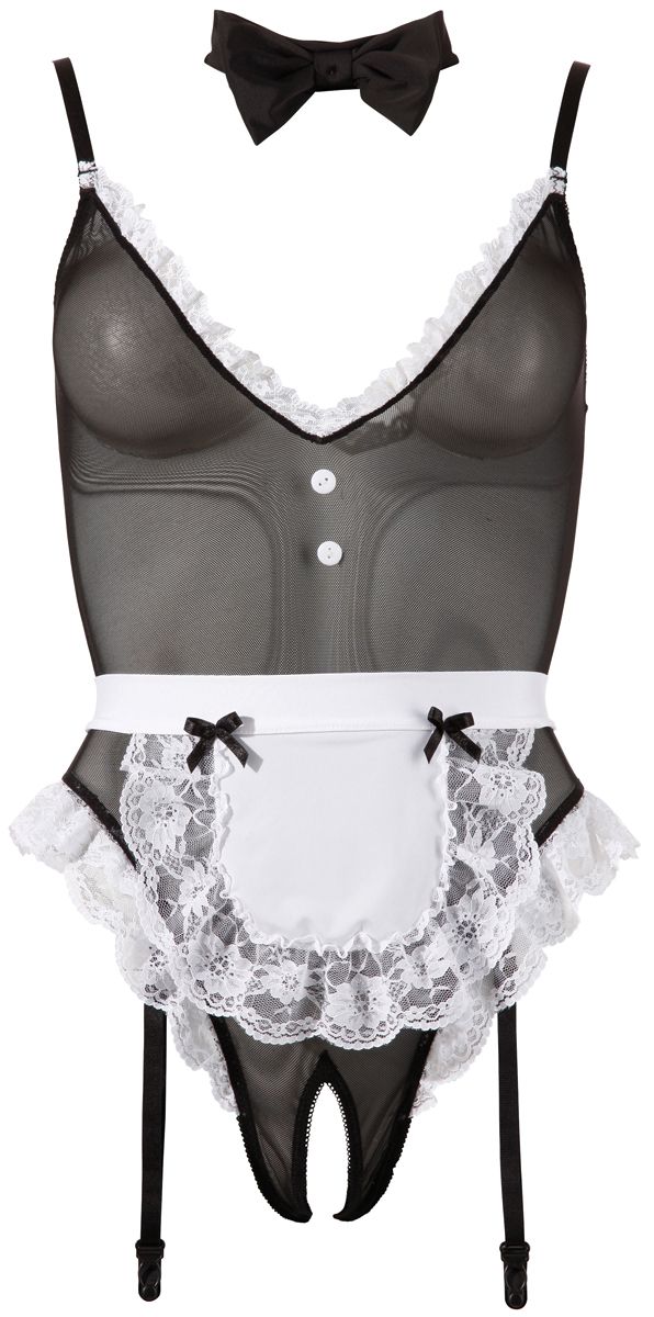 С този костюм на сервитьорка можете да изживеете перфектната ролева игра! Бодито без дъно е изработено от пауърнет с декорации от дантела. Има регулируеми презрамки, а жартиерите са регулируеми и свалящи се. Яката с папионка и велкро закопчалка и престилката за завързване са включени.