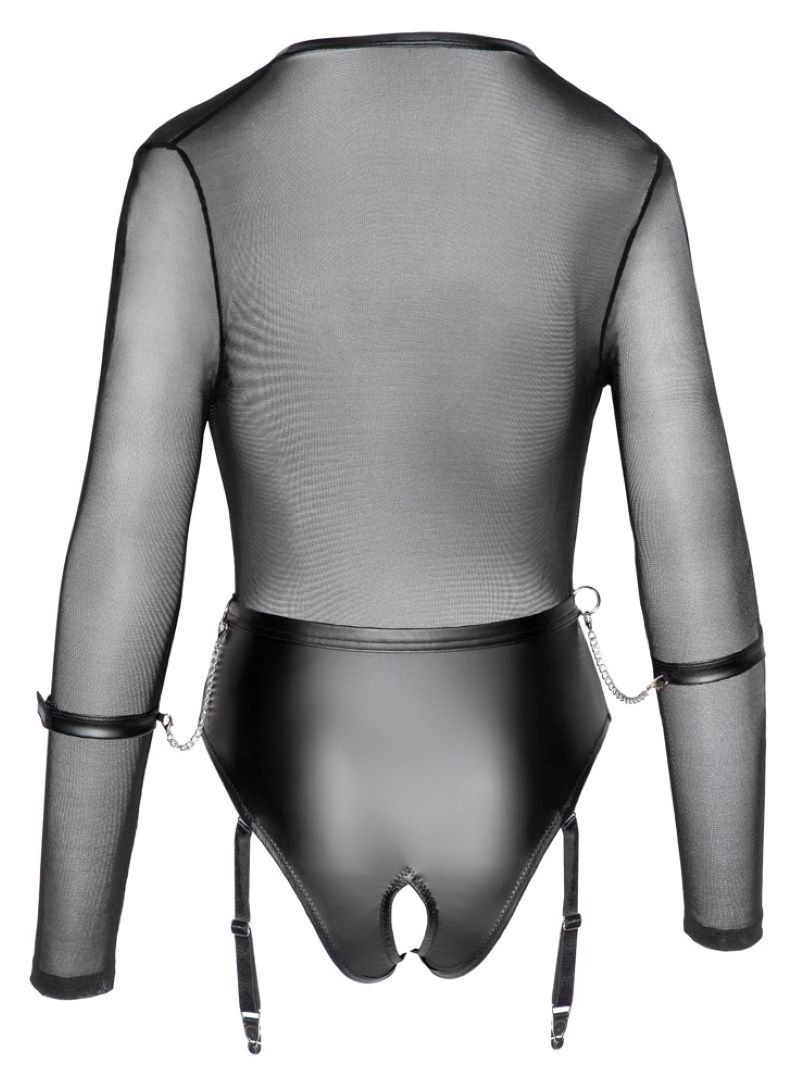 Определено ще изпъкнете с това разтърсващо боди с жартиери! Това изключително ниско изрязано боди с прозрачен материал в матов вид е сбъдната фантазия. Бодито е с жартиери, вградени белезници и отворен чатал за дръзка визия. Презрамките за жартиери са регулируеми и свалящи се.