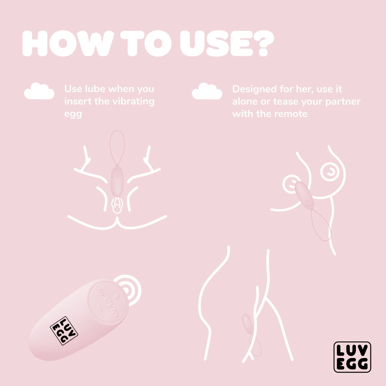 Предизвикайте себе си и партньора си с LUV EGG! Това вибриращо яйце с дистанционно управление е идеално за партньори, които търсят вълнуваща секс играчка. Вибриращото яйце е обвито в мек силикон, който е безопасен за тялото, приятен е на кожата и може да се почиства старателно. LUV EGG има изключително мощен мотор с 12 настройки на вибрациите. Яйцето е водоустойчиво, презареждаемо и може да се използва в комбинация с лубрикант на водна основа.