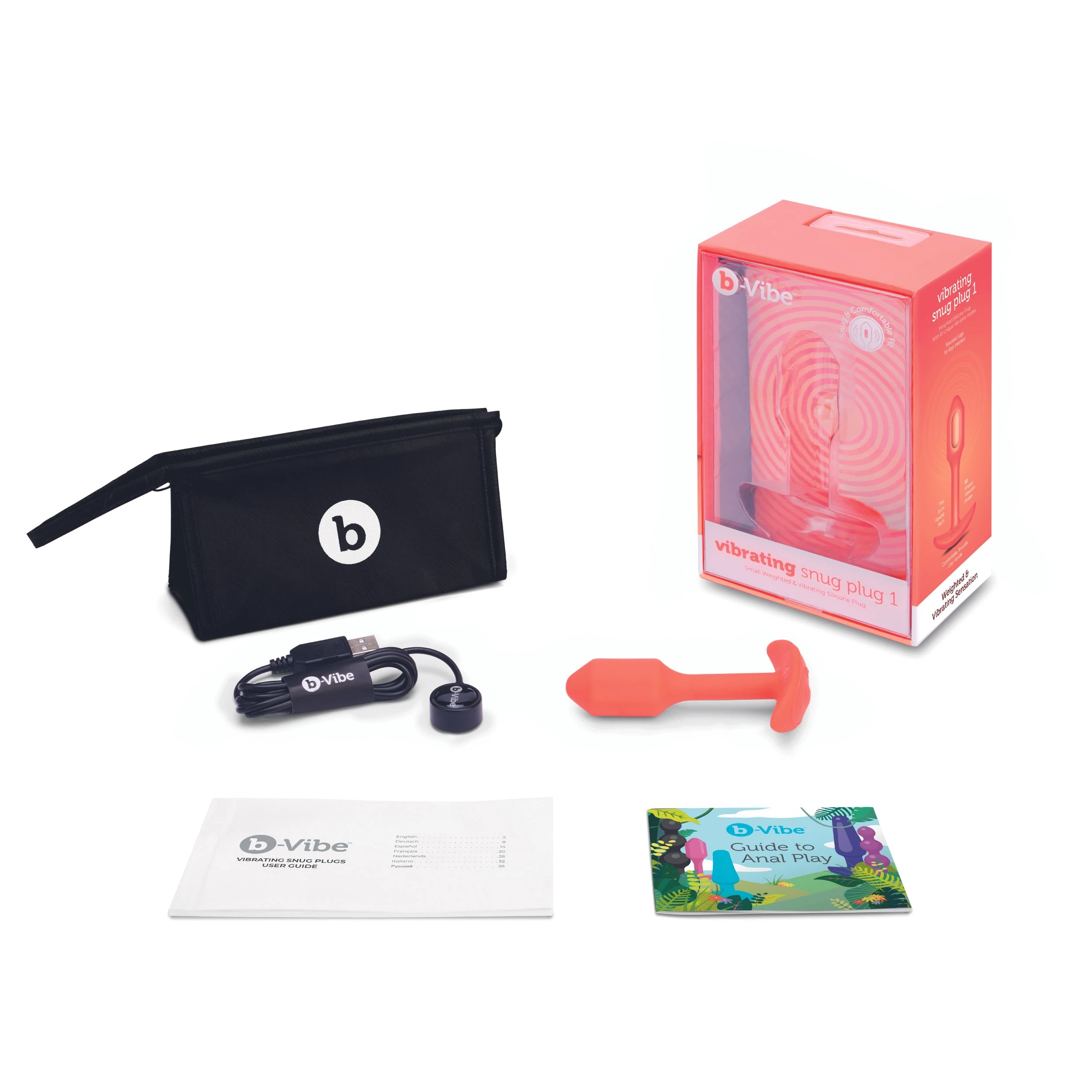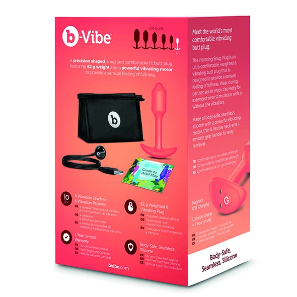 Vibrating Snug Plugs се предлага в дизайнерска, подробна опаковка и включва удобна чанта за съхранение. Ние също така включваме не едно, а две ръководства за начинаещи в аналната игра, както и за любители. Ръководството за анален на b-Vibe е пълно с информация за аналната игра, докато нашето ръководство за Vibrating Snug Plug предоставя полезни съвети, включително как правилно да поставите и премахнете аналния си разширител.
