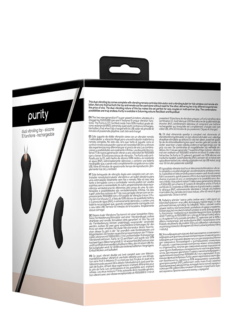 Тази двойно вибрираща играчка е снабдена с вибриращо дистанционно управление / стимулатор и вибриращ куршум за напълно безжично и дистанционно стимулиране/. Не само това, но и играчката и дистанционното могат да се използват сами, без да е необходимо другото, осигурявайки два наистина различни опита за цената на един. Двойната вибрираща природа на тази играчка прави този комплект идеален за соло, двойки или игра на няколко партньора. Комбинациите и възможностите са наистина безкрайни. Purity е наличн в 3 зашеметяващи цвята: червено, черно и Royal Blue! Двата мощни двигателя от ново поколение F1 вибрират при зашеметяващите 9,500 / 6,800 об / мин и разполагат с 10 уникални вибрационни функции. Purity е CE сертифициран, изработен от 100% медицински силикон, водоустойчив, изключително тих и съдържа акумулаторна батерия, която при пълно зареждане с USB кабела осигурява 60 минути страстно време за игра. Просто кликнете и заредете!
