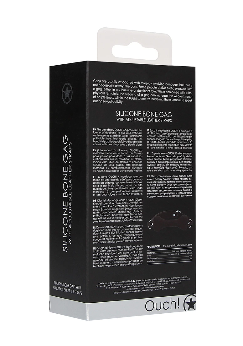 Обичате ли палава игра? Дръжте любовника си тих с този отличителен наустник.  Gag се предлага под формата на „кучешка кост“, за да придаде допълнителна хапка на вашите еротични приключения! Изработен от гладък, висококачествен силикон без фталати, този красиво изработен гег е напълно регулируем и се предлага с две презрамки плюс здрава закопчалка. Използвайте тази играчка самостоятелно или в комбинация с други продукти на Ouch!