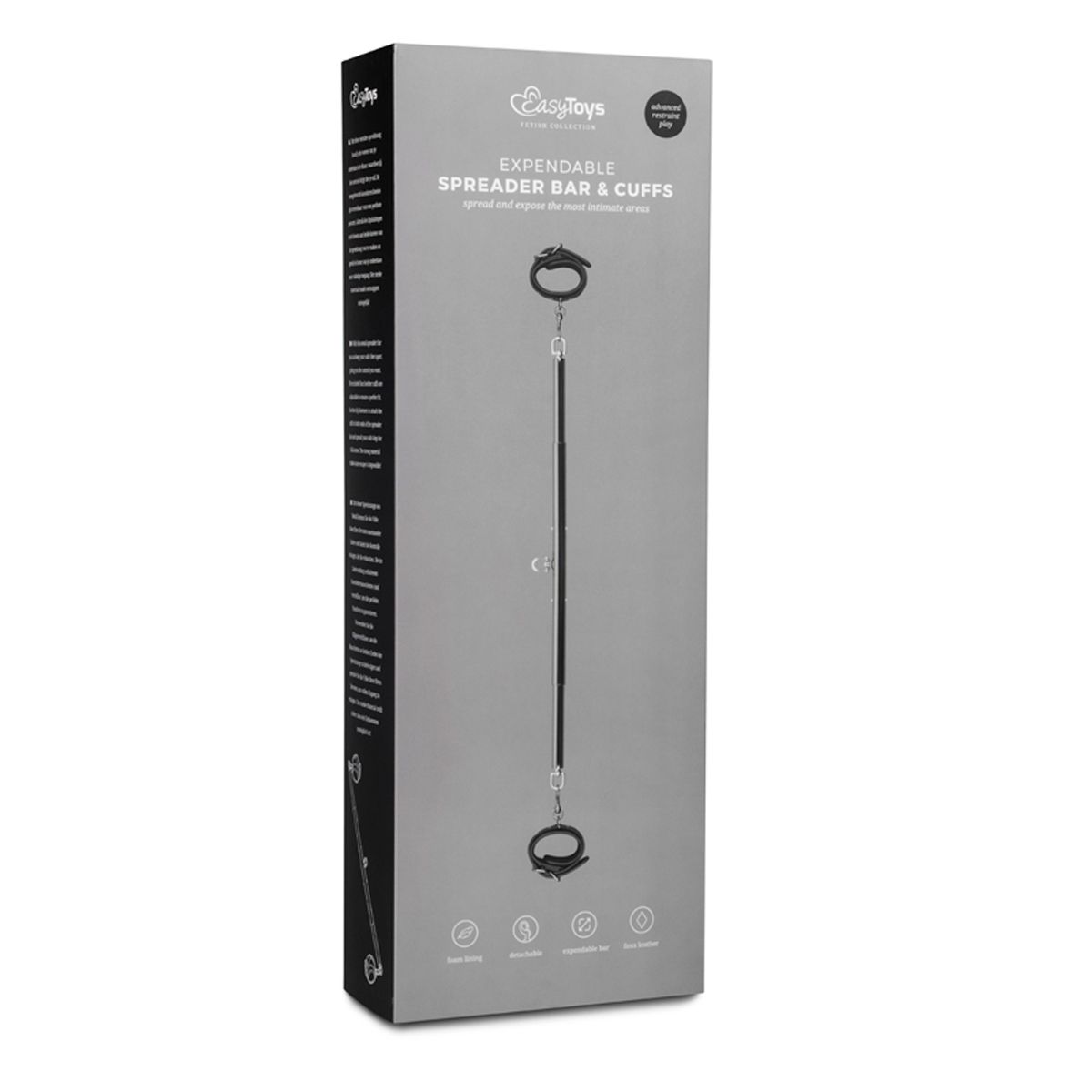 Лостът може да се регулира на дължина от 70 см до 90 см. Кожените маншети също могат лесно да се регулират за перфектно прилягане. Маншетите са прикрепени към лоста със закопчалки за скоби, така че можете да ги откачите и да използвате маншетите отделно. Можете също да използвате пръстените от двата края, за да прикрепите други играчки за връзване, като маншети за глезени, към лоста.
