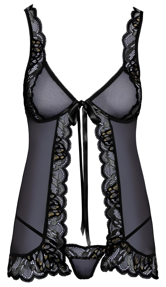 Babydoll & шнур в комплект от kissable. Куклата е изработена от нежна пауърнет и красива дантела. Той е мек и еластичен за удобно прилягане. Късата бебешка кукла е отворена отпред и се закопчава с щипка, която е скрита под декоративната сатенена панделка. Чашките с банели и регулируемите презрамки гарантират перфектно прилягане. Елегантната малка връвчица също е изработена от красива дантела и е изключително съблазнителна, защото има две тесни еластични презрамки, които се събират в областта на чатала.