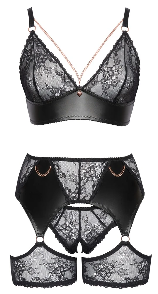 Черният комплект с тиранти от Cottelli CURVES съдържа сутиен, слипове с крачоли и колан с жартиери. Комплектът е изработен от мека, еластична дантела с дантелени вложки за перфектно и много удобно прилягане. Аксесоарите в цвят розово злато придават завършек на тази елегантна визия. Сутиенът е с декоративни верижки в областта на деколтето и висулка между безжичните дантелени чашки. Презрамките и закопчалката на гърба могат да се регулират. Коланът с тиранти има декоративни верижки отпред и закопчалка с кука отзад. Еластичните дантелени жартиери са прикрепени към колана с тиранти с халки. Дантелените слипове са изключително съблазнителни, защото нямат чатала.
