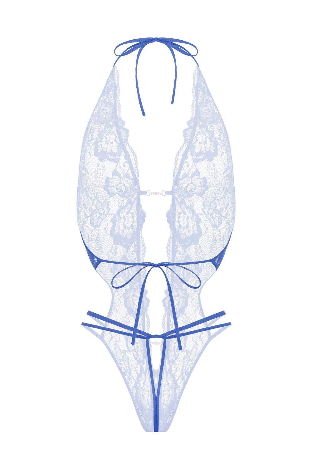 Нашият най-търсен боди Renee вече се предлага в нов цвят, магическо синьо. За да бъде още по-вълнуващ, бодито Renee е без чатал. Бодито се закопчава с презрамка за врата и е с еластични презрамки на гърба. Свободните предни панели са свързани в горната част и под гърдите с кристал. Две сатенени панделки свързват дантелените панели с прашките без чатал.
