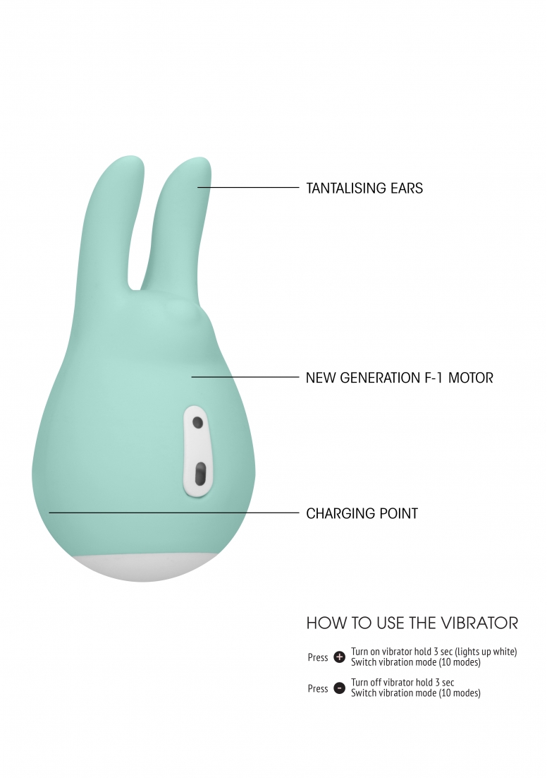 Разтърсващите оргазъм уши на този мини заешки масажор за клитора са изящни, но динамични, което прави тази играчка за клитора идеална за соло или интензивна игра по двойки. Пасва точно в дланта ви, а 2-те еднакво оформени заоблени върха вибрират през неговите 2 величествени точки на вибрация със зашеметяващите 7500 RPM. Той разполага с 10 уникални вибрационни функции, водоустойчив е, изключително тих със само 60 dB и съдържа акумулаторна батерия, която може да бъде напълно презаредена с USB кабела само за 120 минути и ще осигури цели 100 минути страстно време за игра! Изработен е от 100% супер мек медицински силикон и съдържа красиво интегрирано ABS термопластично дъно без фталат и бутон за захранване.