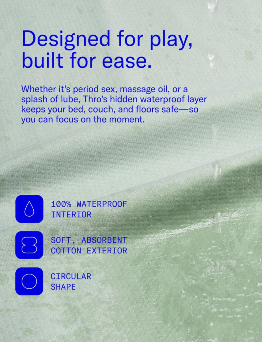 Одеялото за игра Thro от DAME е изработено от ултра мек памук със скрит водоустойчив слой, който поддържа нещата чисти. Удобната торбичка го прави лесно за носене. Дишащо, компактно и многофункционално, идеално за всичко – от секс по време на менструация до закуска в леглото или пикник под звездите.