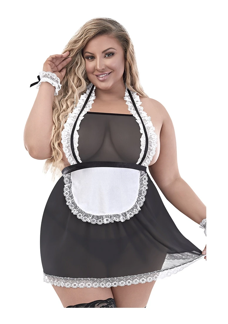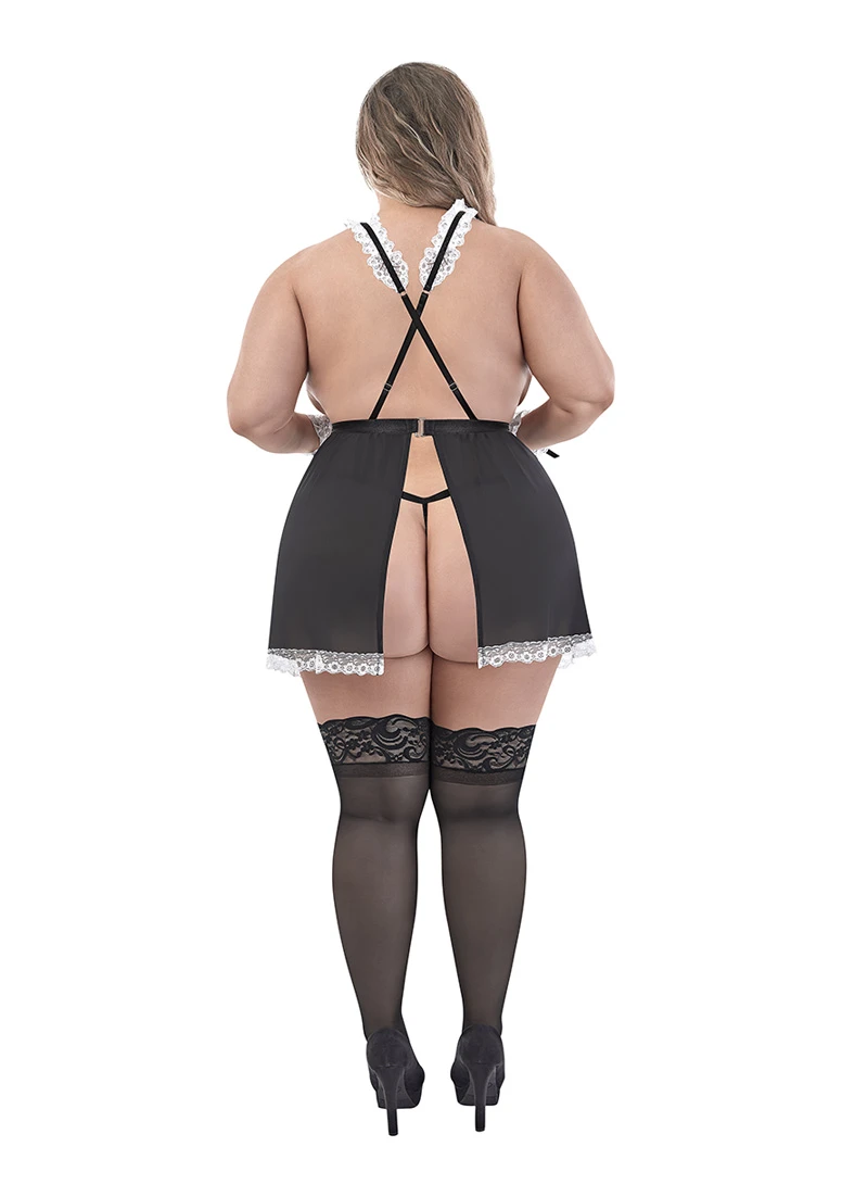 От колекцията Dress Up на Magic Silk този стил включва: Летяща рокля за бебета кукла с презрамки в стил тиранти с детайли от дантела, кръстосани презрамки на гърба, които са регулируеми, прикрепена бяла престилка с детайли от дантела и закопчаване с метална щипка. Комплектът също така включва подходящ бикин с стринги и два дантелени маншета с акценти в черна панделка.