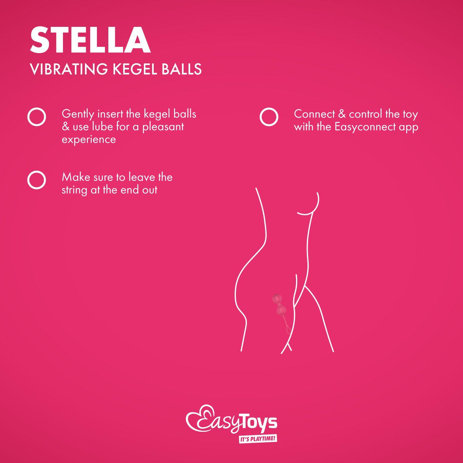 Кегел топките са специално разработени за трениране на тазовото дъно. Чрез тренирането на тазовото дъно можете да се насладите на по-стегната вагина, по-интензивни оргазми, засилени усещания по време на секс и по-добър контрол върху мускулите и пикочния мехур. В същото време вибрациите добавят допълнително вълнение. Изпробвайте ги в уюта на дома си или ги носете в движение за интензивна и вълнуваща тренировка на тазовото дъно. ЗА EASYCONNECT Всички играчки от линията EasyConnect могат да се използват чрез безплатното приложение EasyConnect. Тук ще отключите някои уникални функции: Стандартни модели Когато отворите приложението, можете да се впуснете в забавлението, като изберете един от 9-те стандартни модела на вибрации. С плъзгача можете да персонализирате интензивността на вибрациите. Създайте свои собствени модели на вибрации Можете да сбъднете всичките си най-смелите мечти с функцията Free Touch. Това ви позволява да персонализирате интервала и интензивността на вибрациите и да създадете свои собствени модели на вибрации! След като намерите модел, който ви харесва, можете да го запазите в „Моите акценти“, за да можете винаги да преживявате най-интензивните оргазми. Игра на дълги разстояния Тази функция ви позволява да преодолеете разликата между вас и вашия любим, където и да сте по света. Идеално е за двойки, които имат връзка от разстояние или просто ако искате да изпитате нещо ново и вълнуващо. Чрез споделяне на уникална връзка, вашият партньор може да управлява играчката ви дистанционно и да поеме контрол над вашето удоволствие. Играчката се предлага с вградено заключване при пътуване и когато оставите телефона по време на употреба, екранът ще се затъмни, за да не промените случайно модела или интензитета. Как се активира заключването при пътуване? Задръжте бутона за захранване за 2-3 секунди, докато усетите два кратки звукови сигнала, показващи, че заключването при пътуване е активирано. За да тествате заключването при пътуване, натиснете бутона за захранване веднъж. Мигаща светлина ще се появи два пъти, сигнализирайки, че заключването при пътуване е активно, предотвратявайки случайни вибрации. За да го деактивирате, задръжте бутона за захранване за 2 секунди, усещайки два кратки звукови сигнала, потвърждавайки, че заключването при пътуване вече е деактивирано. Как се включва играчката? Задръжте захранването за 1 секунда, докато усетите кратко звуково сигнализиране. Това показва, че играчката е включена и в режим на готовност, готова за свързване чрез приложението.