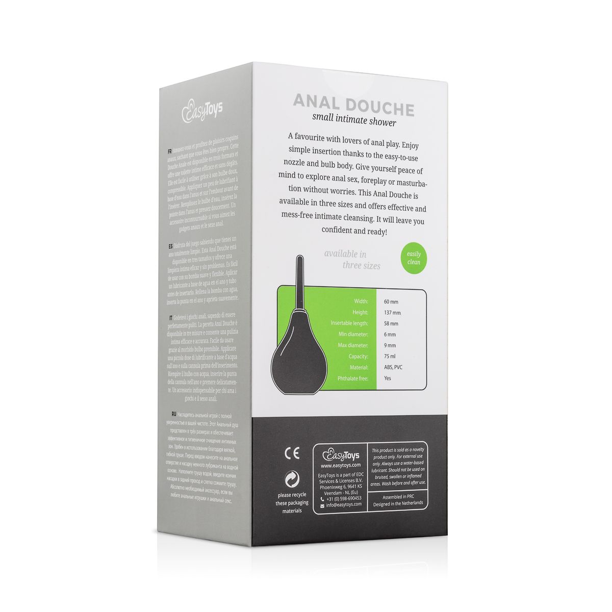 Любимец сред любителите на аналната игра. Насладете се на лесното поставяне благодарение на лесния за употреба накрайник и изпъкналото тяло. Осигурете си спокойствие и се насладете на анален секс, любовна игра или мастурбация без притеснения. Този анален душ се предлага в три размера и предлага ефективно и безпроблемно интимно почистване. Ще ви остави уверени и готови! Обърнете внимание! Използвате ли интимния душ както анално, така и вагинално? Винаги почиствайте добре както вътрешната, така и външната страна с хладка вода и препарат за почистване на играчки, за да сведете до минимум евентуалните (вредни) бактерии.