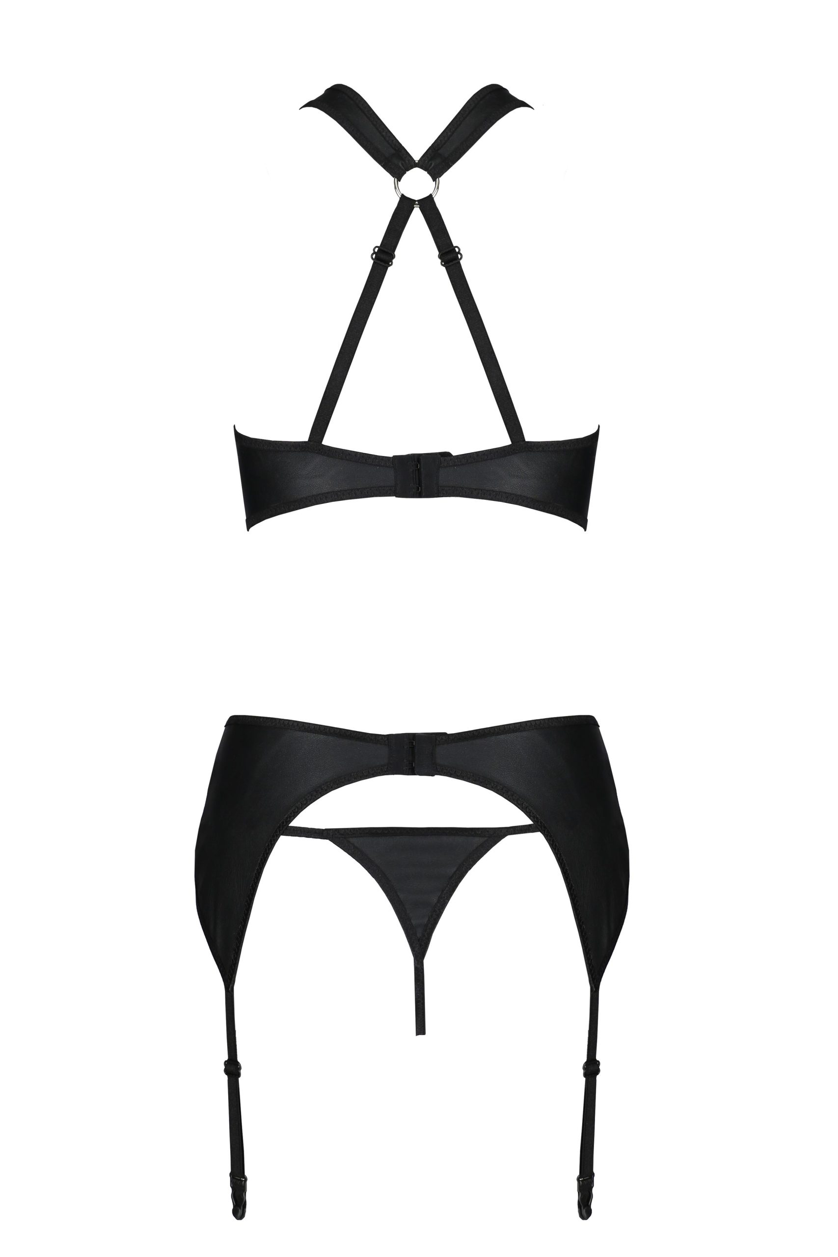 Ексклузивен и екстравагантен комплект, състоящ се от сутиен, прашки и колан за тиранти. Непреходната кожена визия и материалът с щампа от флок са оригинална комбинация, която винаги изглежда добре.
