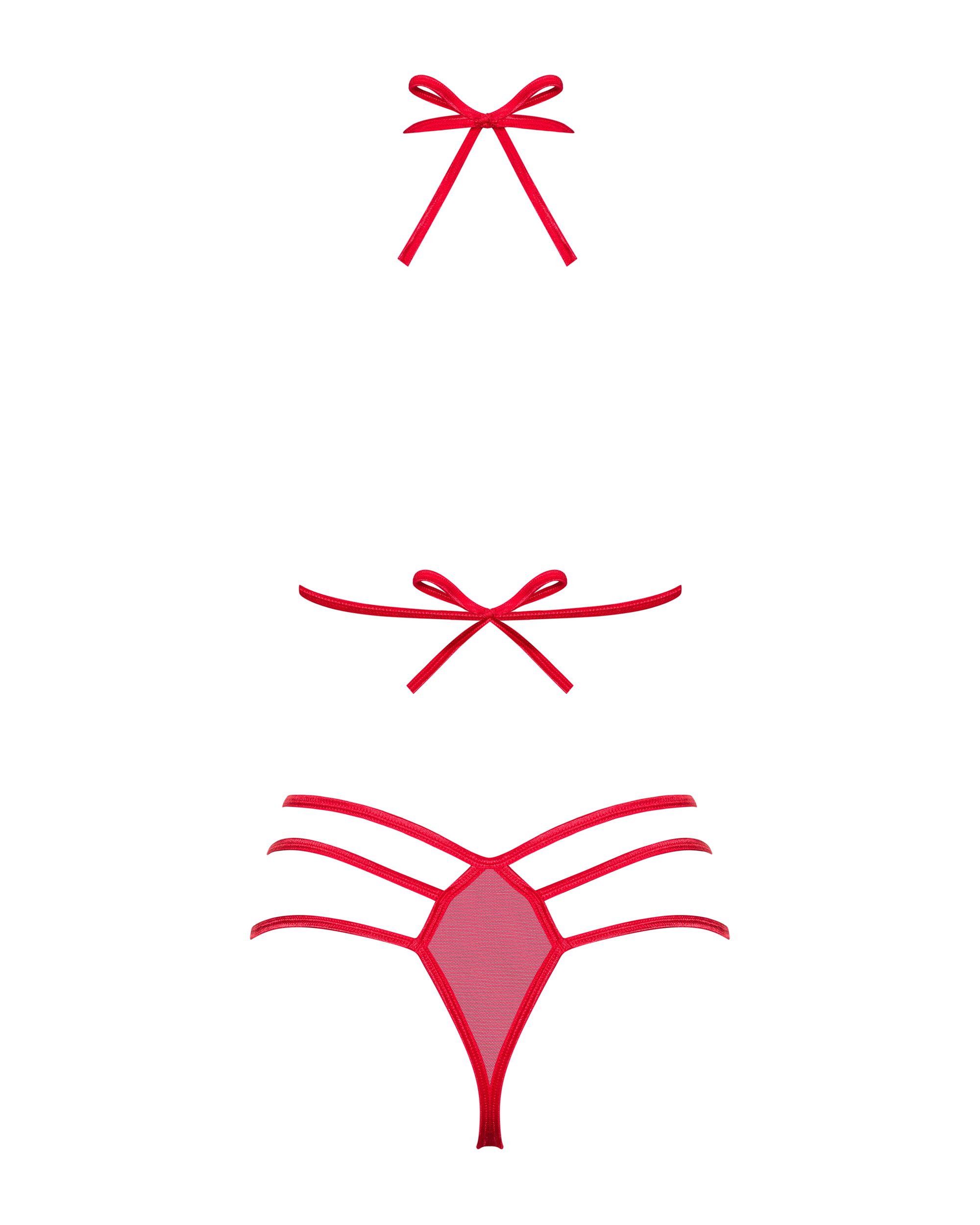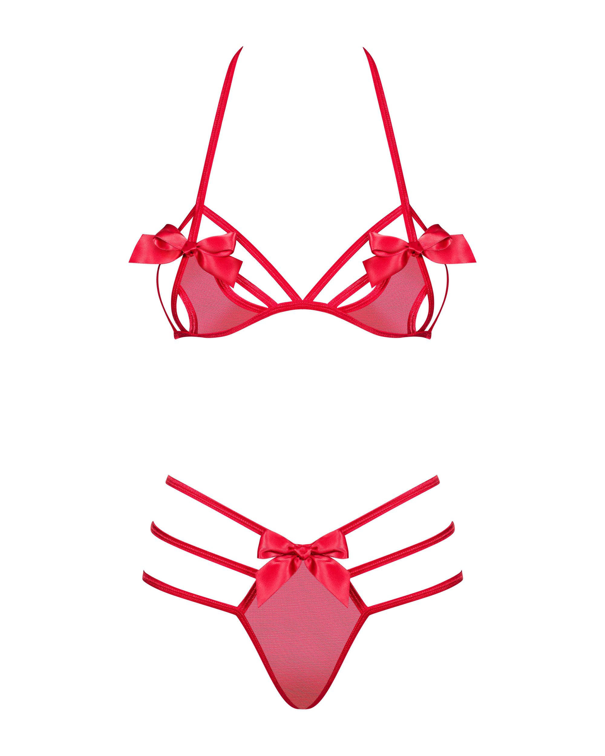 Комплект от 2 части със сутиен и прашки, изработени от полупрозрачна мрежа, декорирани с малки панделки. Презрамките могат да се завържат отзад.