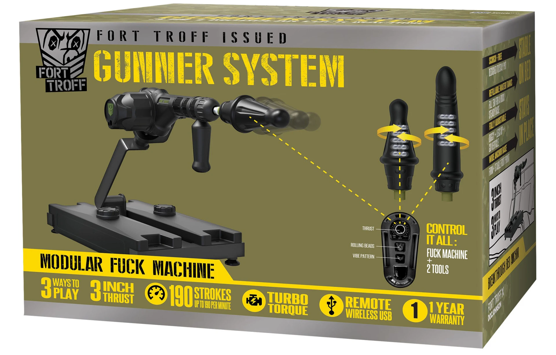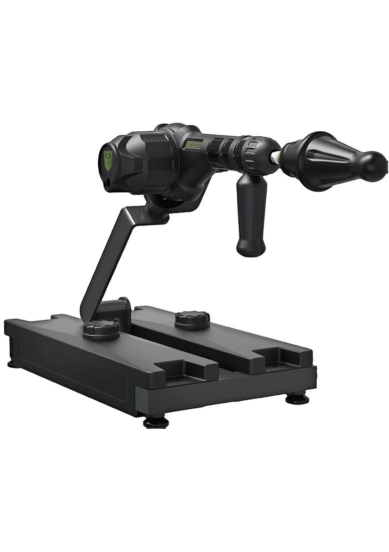 Gunner System на Fort Troff е безупречно проектирана 3-в-1 модулна Fuck Machine за всеки, от начинаещи до изключително напреднали играчи. Могат да се използват две вибриращи и въртящи се глави, монтирани към цялата основа на машината, с ръчния турбо пистолет или самостоятелно с включената дръжка. Основата е регулируема, за да ви чука във всяка позиция, която искате. След като се напълни с вода, пясък или тежък материал по ваш избор, той ще остане стабилен на леглото или любимото ви място за игра. Включеното дистанционно управление прави всичко; той контролира скоростите на въртящия момент, както и въртящите се зърна и вибриращите функции на Инструментите. Плюс това, дистанционното е магнитно и може да се прикрепи към основата на Gunner, така че никога да не изчезне. С включения адаптер Vac-U-Lock има стотици начини за игра.