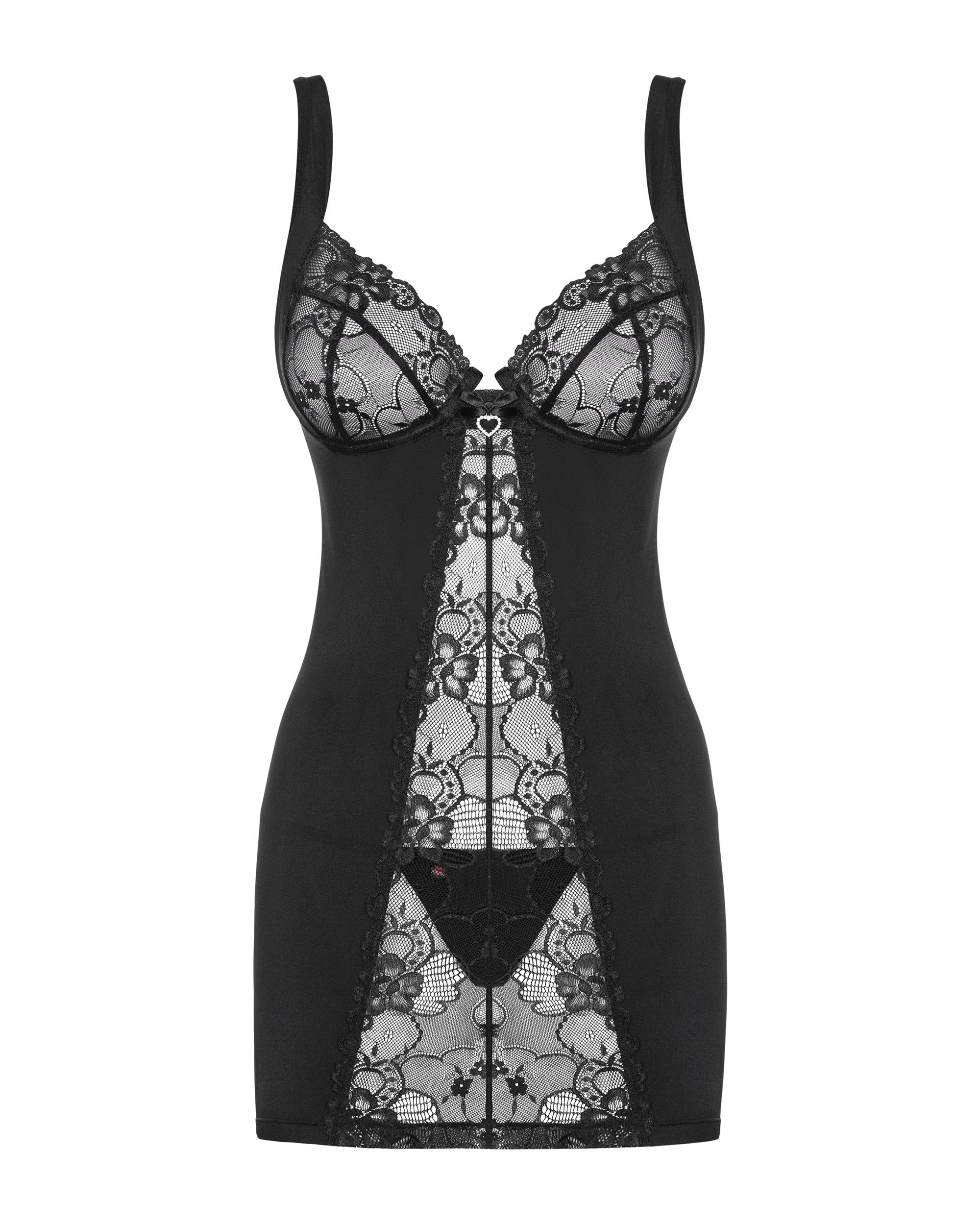 Този елегантен неглиже е частично прозрачен и е украсен с елегантно сърце между чашките. Презрамките са регулируеми, а прашките в комплекта са включени.