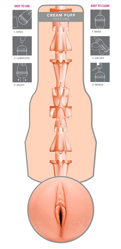Лесният за хващане мастурбатор Kenzie Reeves Creampuff от Fleshlight е в дискретен дизайн на фенерче и има реалистична реплика на вагината на еротичната звезда Kenzie Reeves. Каналът за удоволствие има различни стимулиращи текстури и различни диаметри, което означава, че се усеща като стегнатата вагина на Kenzie. Също така е идеален за интензивен, оргазмен масаж по време на ръчна работа. Вътрешният ръкав е изработен от изключително мек, подобен на кожа материал. До отвора има и подпис на Кензи. Калъфът също може да се извади от кутията за почистване.