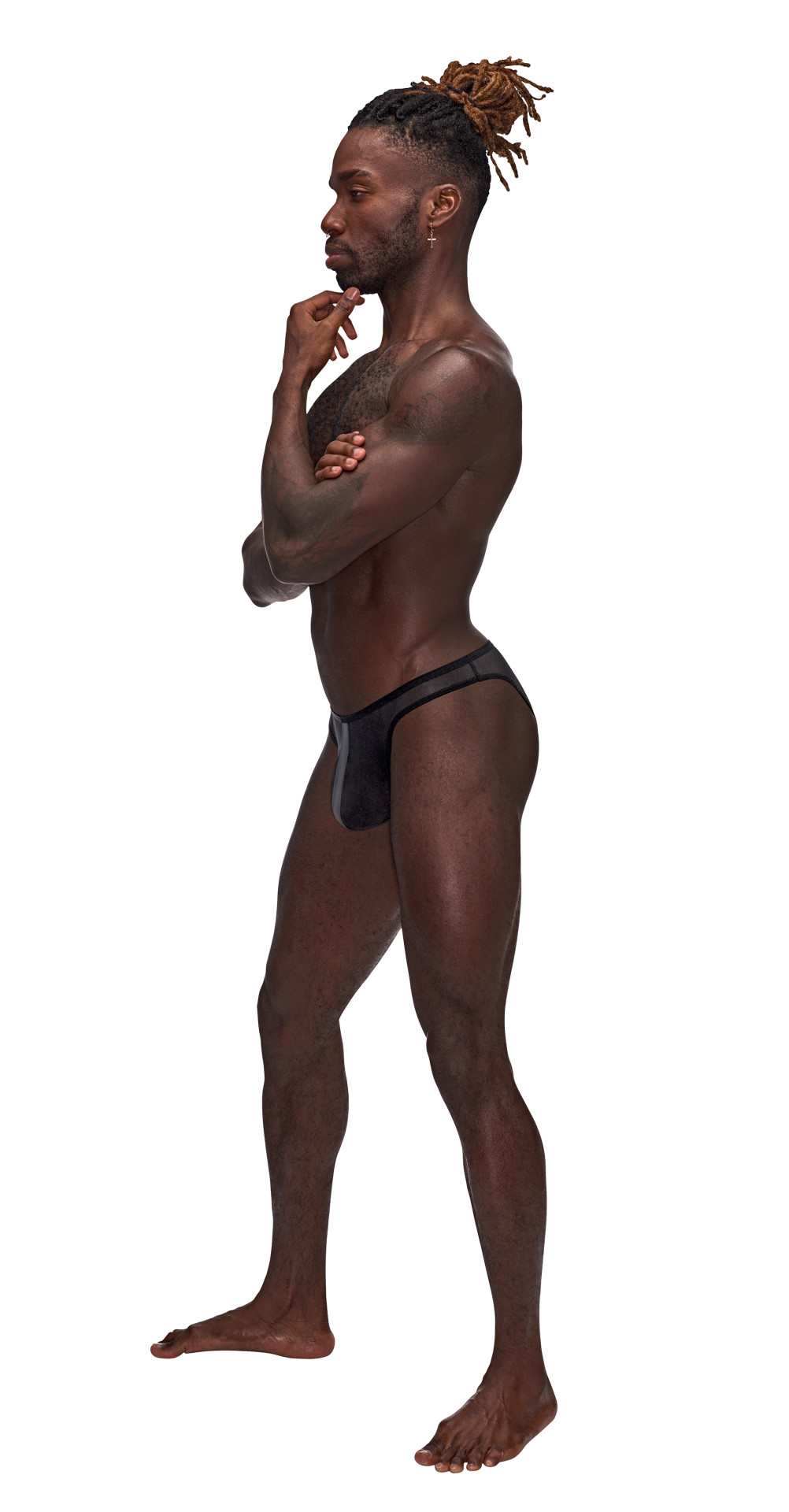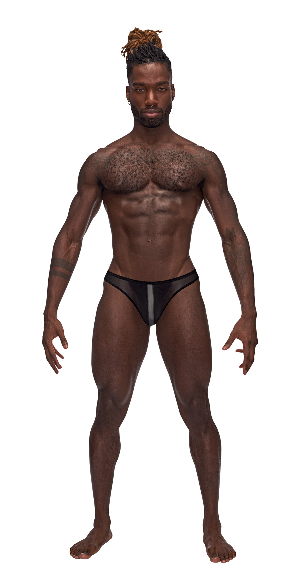 От колекцията Landing Strip на Male Power, Bikini Brief се отличава с тънка плюшена еластична гарнитура на талията и краката, тон в тон матова ониксова лента с вложка през торбичката и задната част и декоративен метален етикет на марката на задната лента на талията.