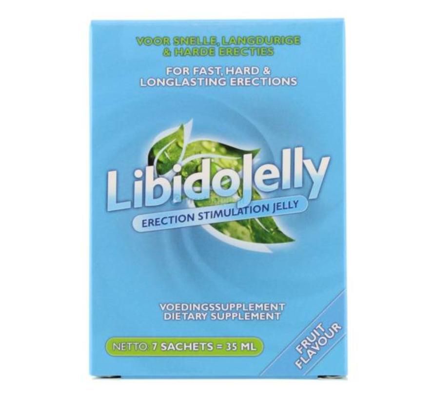 LibidoJelly е първият течен продукт за ерекция, пуснат на пазара. Предимството на този продукт за ерекция е, че може да се абсорбира в тялото доста бързо, което означава, че ефектът също може да бъде доста бърз. В рамките на няколко минути ефектът може да бъде забележим като приятно изтръпване на нарастваща ерекция, без никакви негативни странични ефекти! Препоръчителна употреба: Приемайте 1 саше гел непосредствено преди сексуална активност. Поставете гела директно в устата или го смесете в чаша вода. Съставки: Малтитолов сироп, Вода, Глицерол, Екстракт от Гинко Билоба, Екстракт от Муира Пуама, Екстракт от Мака, Калций (като монокалциев цитрат).
