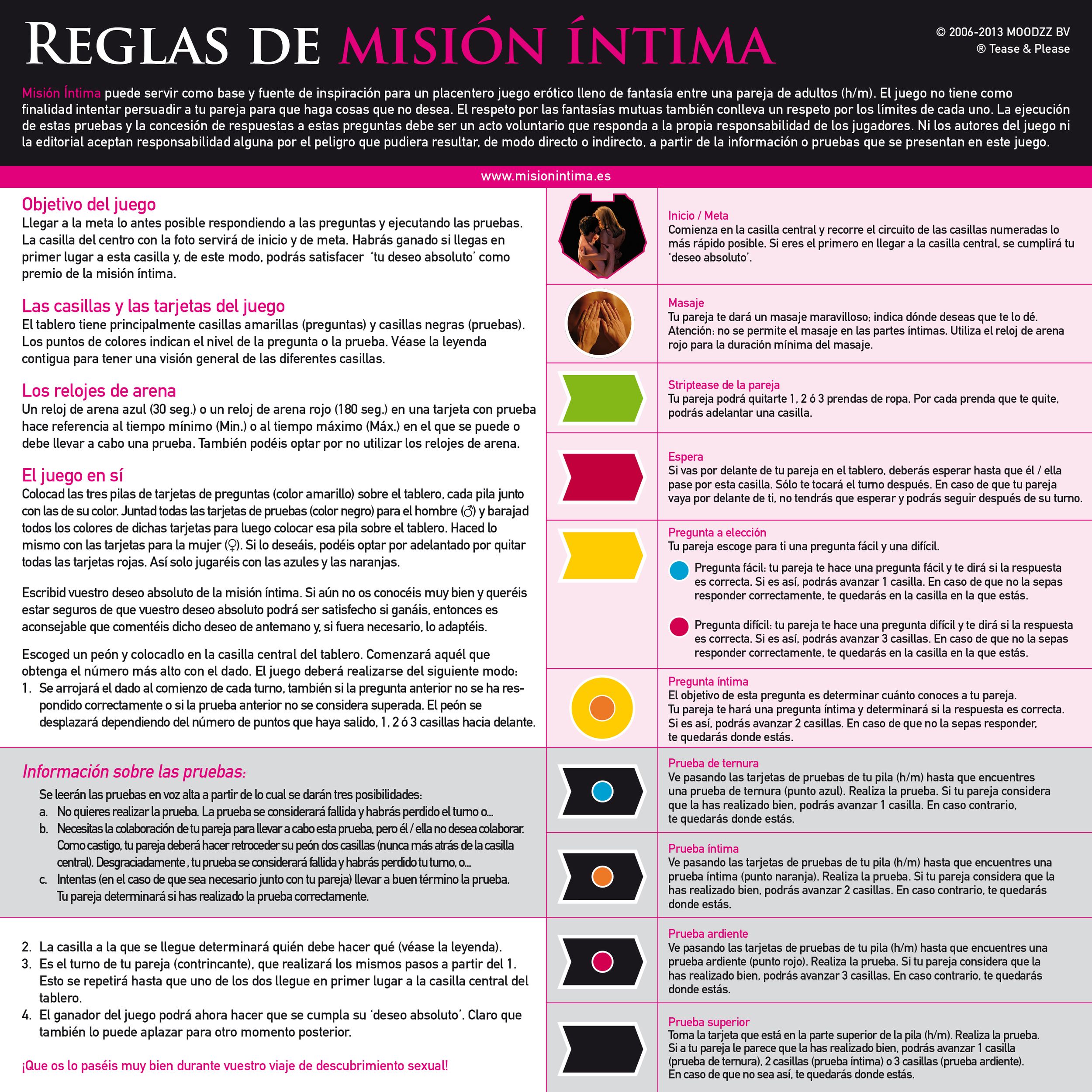MisiГіn GЌntima te lleva a un viaje de descubrimiento, donde lo mìs importante es disfrutar. Por medio de 480 preguntas y actividades tе y tu pareja descubrirеis lo que mìs os gusta. El juego comienza con pruebas cariìosas y romìnticas, pasando despuеs por actividades mìs Ãntimas, para llegar finalmente a las pruebas mìs pasionales en las que todo estì permitido y nada es obligado. De manera lÃêdica se van rompiendo barreras y os acercìis mìs el uno al otro. El juego es cautivador, apasionante, directo y atrevido, a veces desternillante, pero sin perder nunca el respeto y el buen gusto. En este juego no hay obligaciones y todo es posible hacer al gusto de cada uno.