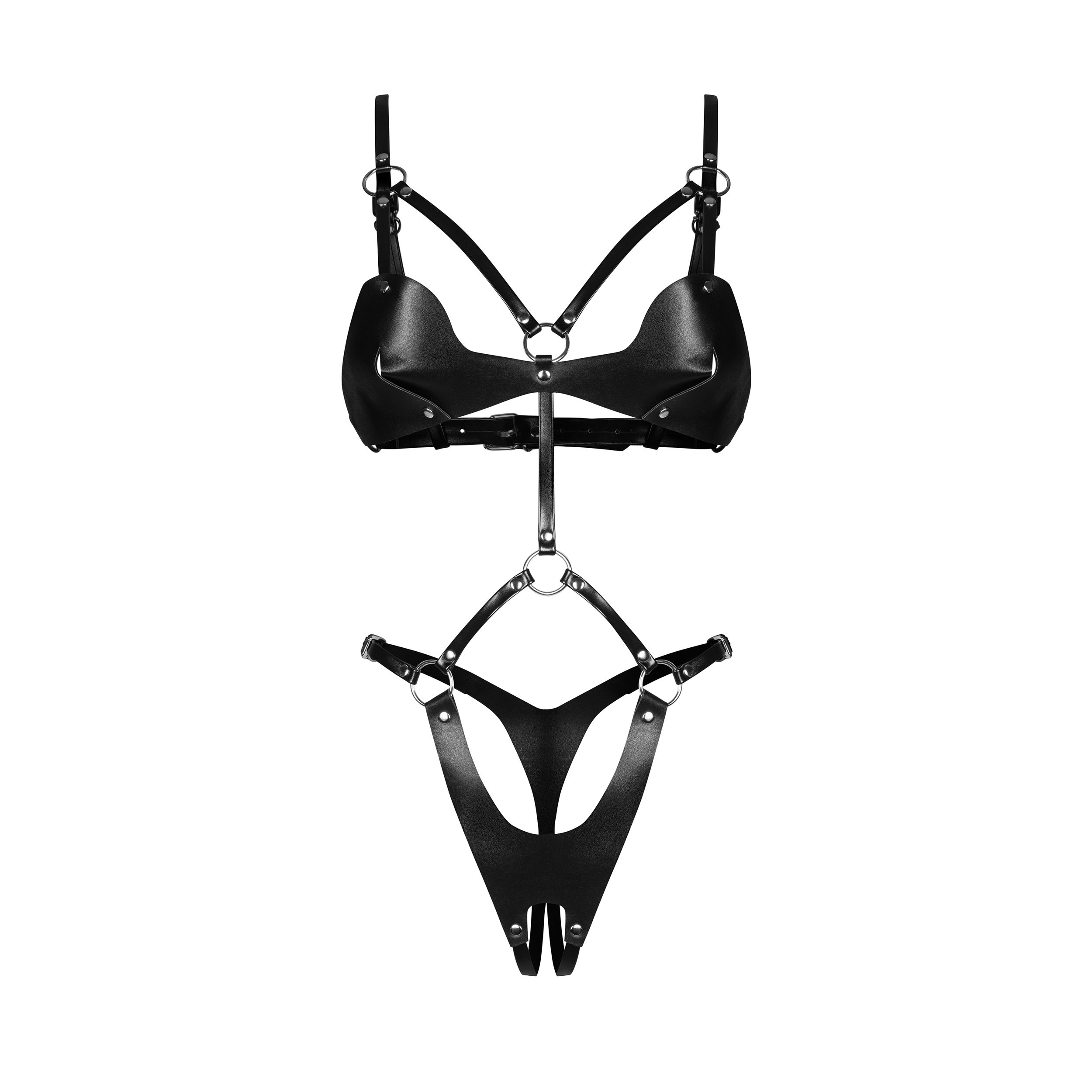 Освободете вътрешната си съблазнителка с тениската без чатала Dame Control, където чувствеността среща изтънчеността. Изработена от елегантна синтетична кожа и украсена с впечатляващи сребърни акценти и шипове, тя добавя нотка на дръзка елегантност. Множеството регулируеми презрамки осигуряват перфектно прилягане, прецизно подчертавайки извивките ви.