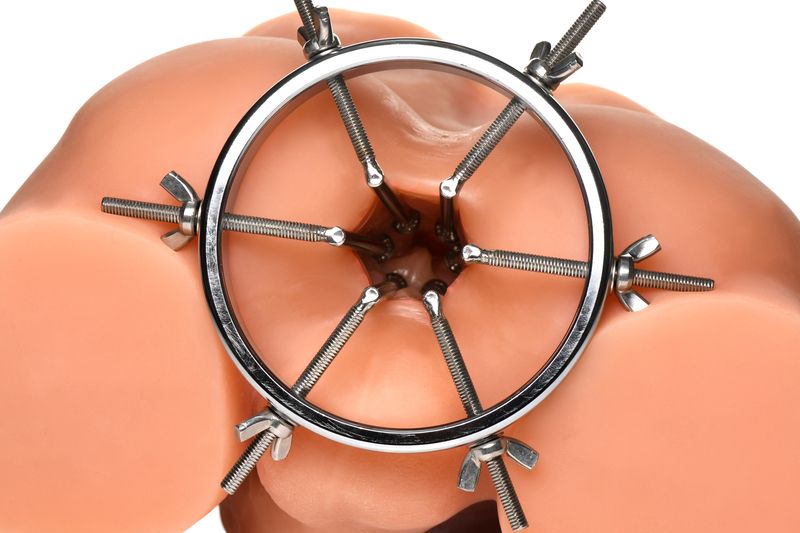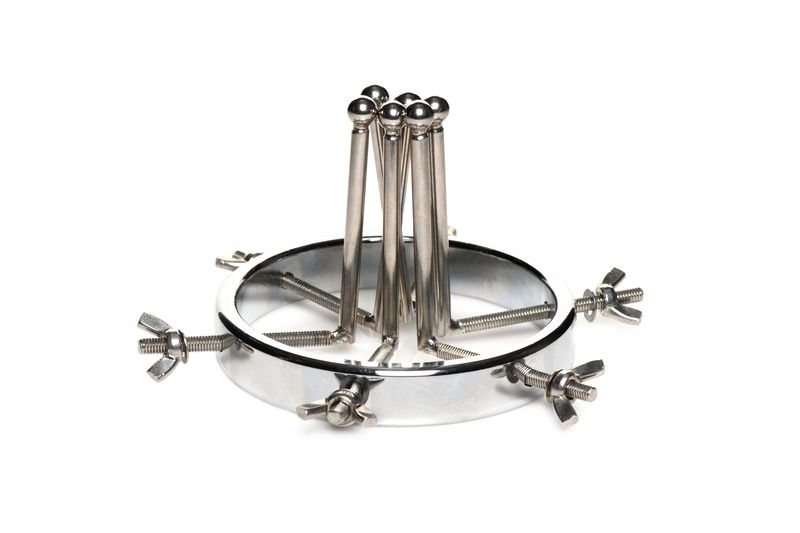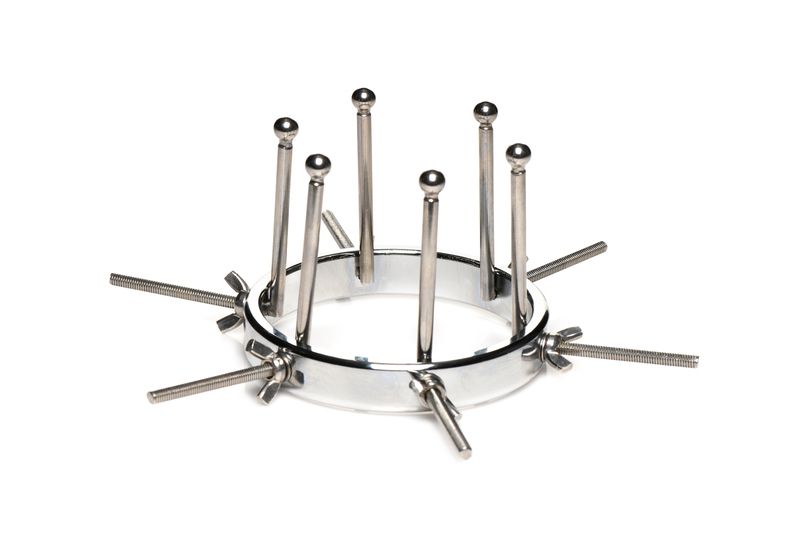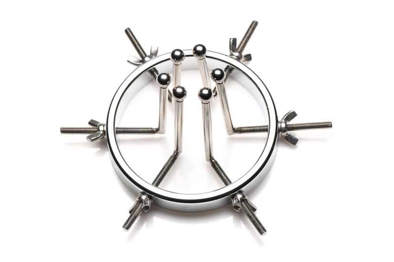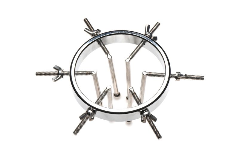 Изработена от здрава, издръжлива, без никел и неръждаема стомана, тази уникална анална тапа е съвместима с всички видове лубриканти. Тапата се състои от един голям пръстен с регулируем диаметър, вариращ от 2,5 до цели 10 сантиметра. 6-те гладки пръчки имат малки кръгли мъниста в края, за да осигурят комфорт по време на употреба. Когато е напълно разтегната, тя е достатъчно голяма, за да се промуши през нея юмрук. Всеки дилататор може да се затяга или разхлабва поотделно с помощта на крилчатите гайки. Почиствайте след употреба с хладка вода и препарат за почистване на играчки.