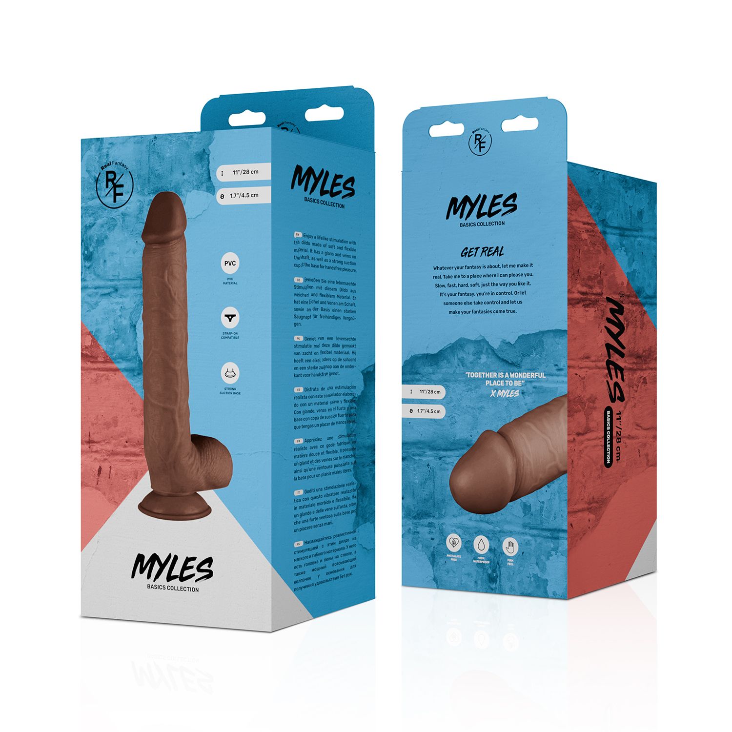 Насладете се на вкусна стимулация с дилдото Myles от колекцията Real Fantasy! Този голям дилдо е изработен от гъвкаво PVC и е с реалистични вени и скротум. Благодарение на здравата вендуза, можете да залепите дилдото към всяка гладка или равна повърхност или лесно да го поставите в strap-on колан за удоволствие без ръце. Използвайте дилдото с лубрикант на водна основа. След употреба почистете дилдото с хладка вода и препарат за почистване на играчки и го подсушете с кърпа без власинки.