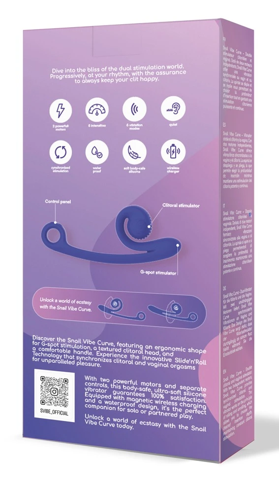 Водоустойчивият Snail Vibe Curve има два безшумни мотора, които осигуряват синхронна клиторна и вагинална стимулация. Двата мотора могат да се управляват независимо и предлагат 5 режима и 5 скорости, за общо над 600 приятни комбинации. Всичко може да се управлява удобно с едно натискане на бутон върху удобния пръстен за захващане. И двата мотора осигуряват нискочестотни, дълбоки и тътнещи вибрации в интимната зона – тази играчка кара всичките ви нерви за удоволствие да вибрират както никоя друга!