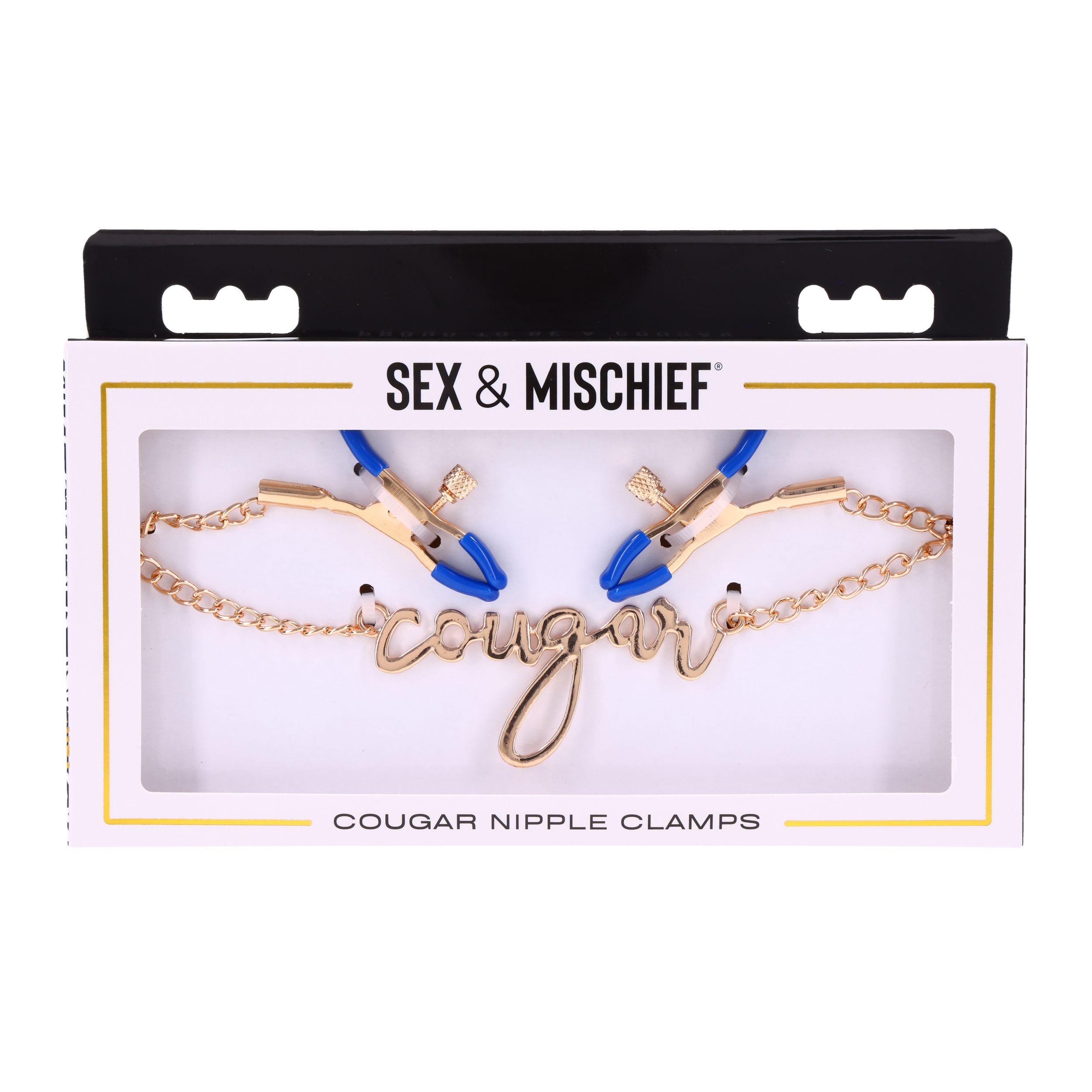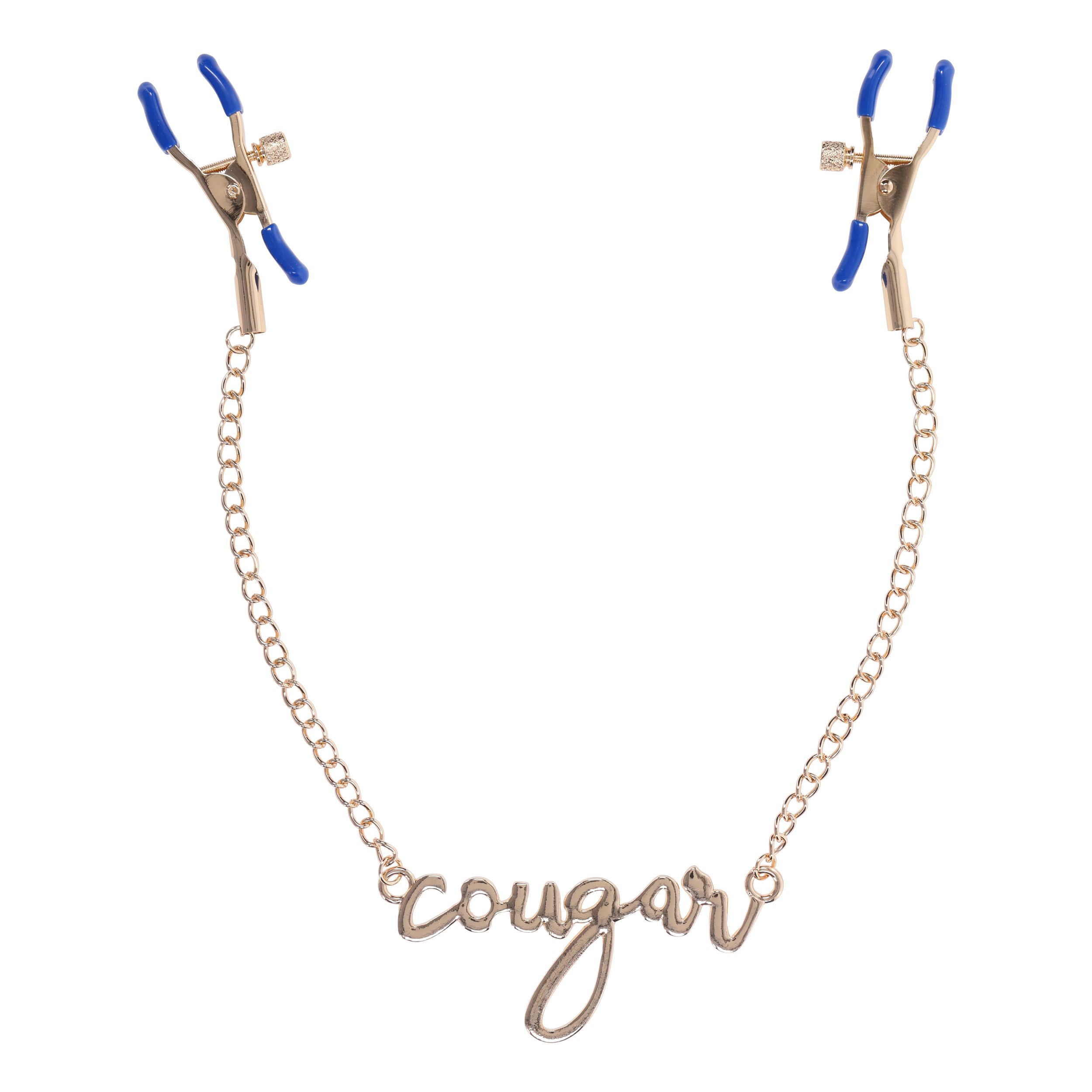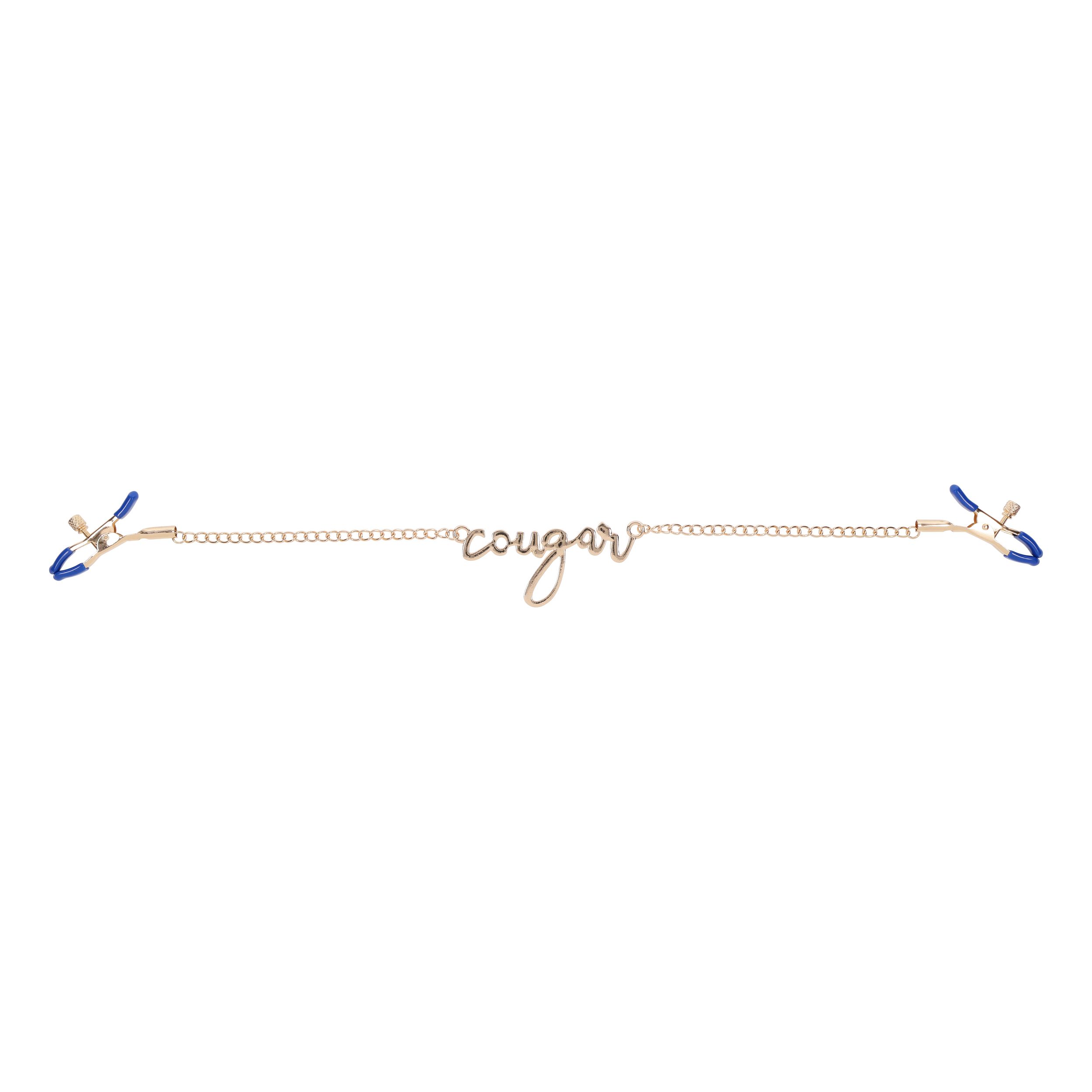 Тези елегантни скоби са с луксозна златна верижка с надпис “Cougar” в курсив между тях, излъчващи едновременно стил и игривост. С регулируемо опъване, тези скоби са идеални за изследване на нови усещания. Примамливият син цвят добавя смел щрих, правейки всеки момент едновременно стилен и стимулиращ. Двустранните гумени накрайници осигуряват удобно захващане, а регулируемото опъване ви позволява да персонализирате интензивността според вашите желания. С дължина от 42 см, верижката предлага достатъчно място за игриви движения. Оставете въображението си да се развихри и открийте вълнуващите преживявания, които тези универсални скоби за зърна могат да осигурят.