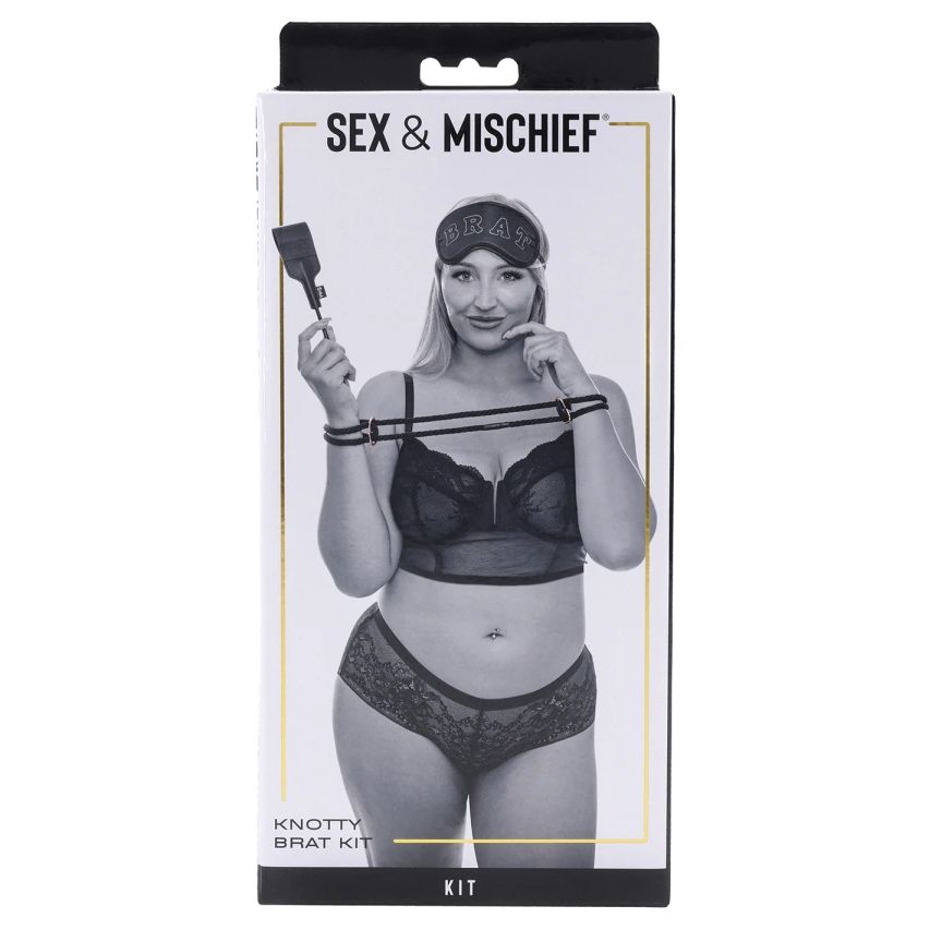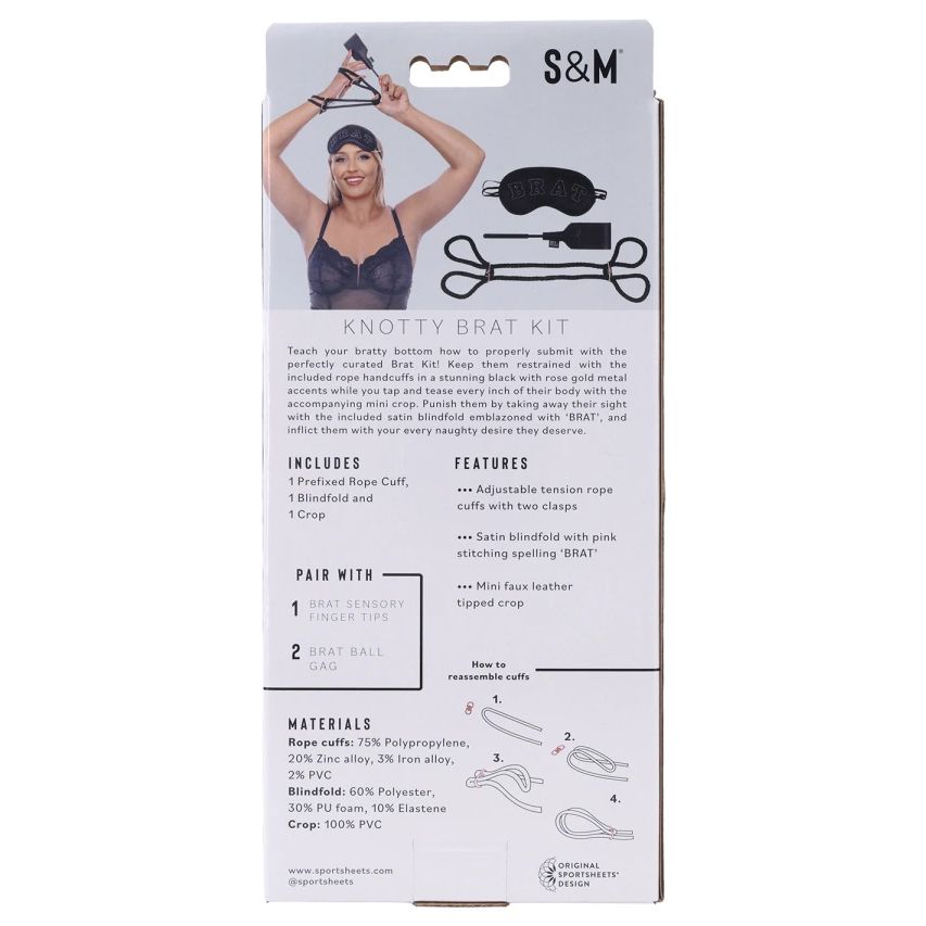 Дръжте ги здраво с включените въжени белезници в зашеметяващо черно с метални акценти от розово злато, докато потупвате и дразните всеки сантиметър от тялото им с придружаващата мини къса панталонка. Накажете ги, като им отнемете зрението с включената сатенена превръзка за очи, украсена с надпис „BRAT“, и им причините всяко палаво желание, което заслужават. Характеристики: Регулируеми въжени белезници с две закопчалки, сатенена превръзка за очи с розово златист шев, надпис „BRAT“, мини къса панталонка с връх от изкуствена кожа.