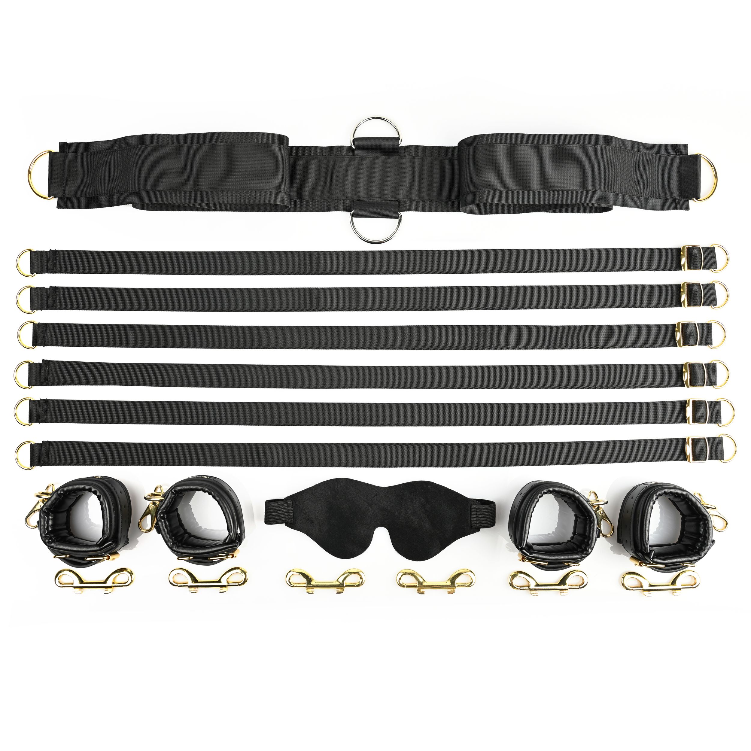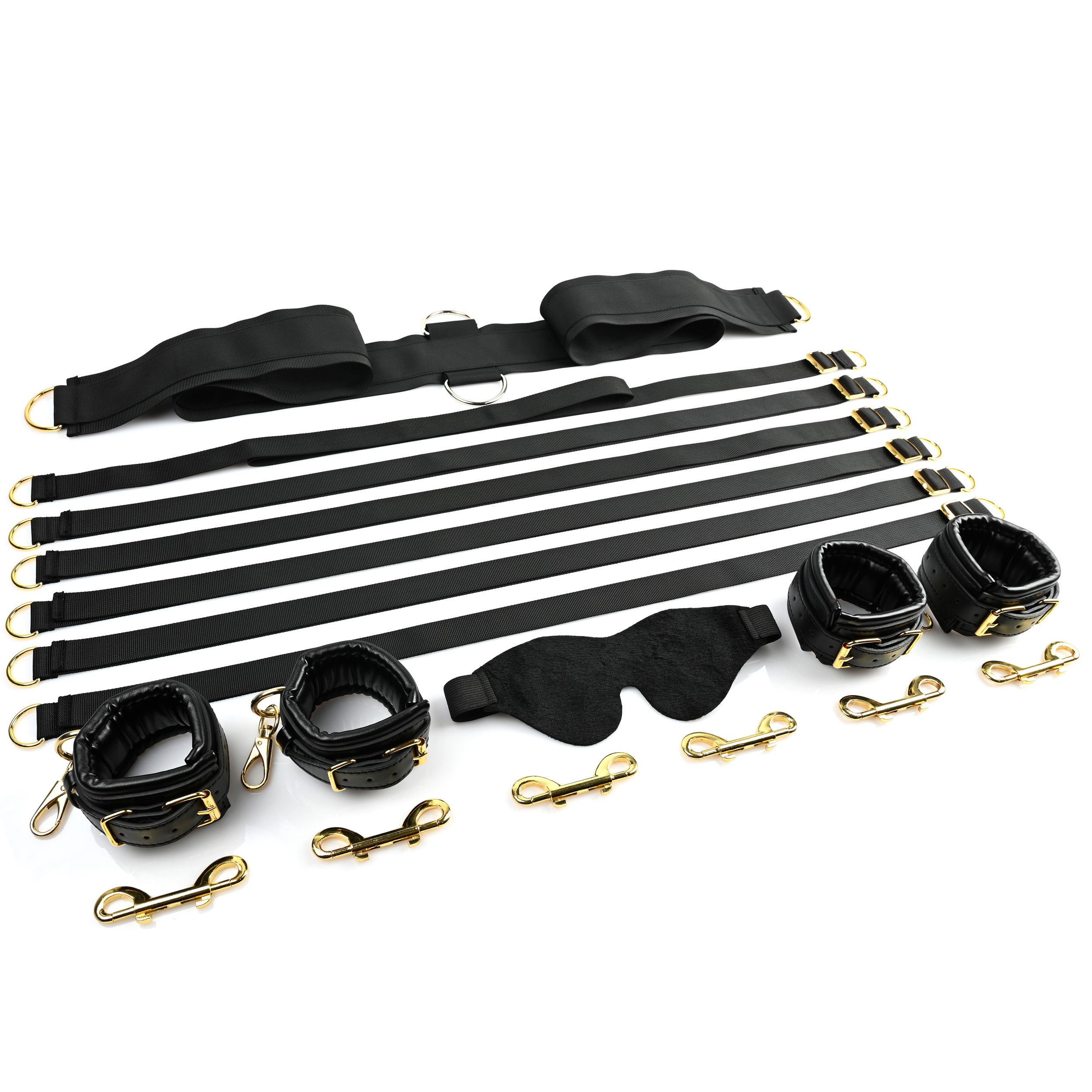 Това специално издание на нашите най-продавани ограничители под леглото издига играта на ново ниво. Лесно комбинирайте любимите си продукти за ограничаване, като използвате двете допълнителни каишки за ограничаване, които вече са общо шест. Комфортът със стил е очевиден с добавянето на златист обков, включително шест издръжливи, двустранни закопчалки. Включете пищната мека превръзка за очи, за да добавите очакване за игра. За да използвате, просто плъзнете каишките под матрака си за незабавна спалня за обвързване. Позиционирайте каишките около главата на матрака или около страните.[MEER_INFO] Комбинирайте с перо, гъделичкаща играчка, шамарче или гребло. Използвайте свободните си ръце, за да гъделичкате и дразните партньора си. Характеристики: – Подходящ за всеки матрак – Лесен за инсталиране – Шест регулируеми каишки за ограничаване – Четири висококачествени белезника от изкуствена кожа за китките/глезените с катарама – Изцяло златен обков – Шест издръжливи, двустранни закопчалки – По-дебела, по-издръжлива централна свързваща каишка – Добавена мека превръзка за очи – Ограничена доживотна гаранция Здрава найлонова свързваща каишка за закрепване се плъзга под матрака ви, за да закрепи шест регулируеми каишки за ограничаване. Четири каишки завършват с висококачествени белезници за китките и глезените от изкуствена кожа със златист обков, докато две са изработени с примки, които обещават всякакъв вид лостове. Позиционирайте каишките около матрака си точно както ви харесва, завържете здраво любимия/любимата си и пъхнете меката кадифена превръзка за очи върху очите му/ѝ за сесия, пълна с изненади. В кутията: – 4 белезника за китките/глезените 25,4 см – 6 регулируеми каишки за придържане 152 см – 1 свързваща каишка 154 см – 6 златни двустранни закопчалки 8,9 см – 1 мека превръзка за очи Материали: 50% полипропилен, 15% полиуретан, 13% полиуретанова пяна, 12% метал без никел, 8% полиестер, 2% еластан