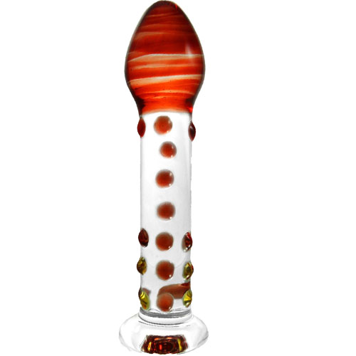 Обикновен дизайн, но с вулканично удоволствие, това е едно класическо стъклено дилдо, но с допълнителни екстри. Заострената му, обла глава води плавно до редиците от изпъкнали точки, които постепенно се увеличават по-надолу по дължината на дилдото.