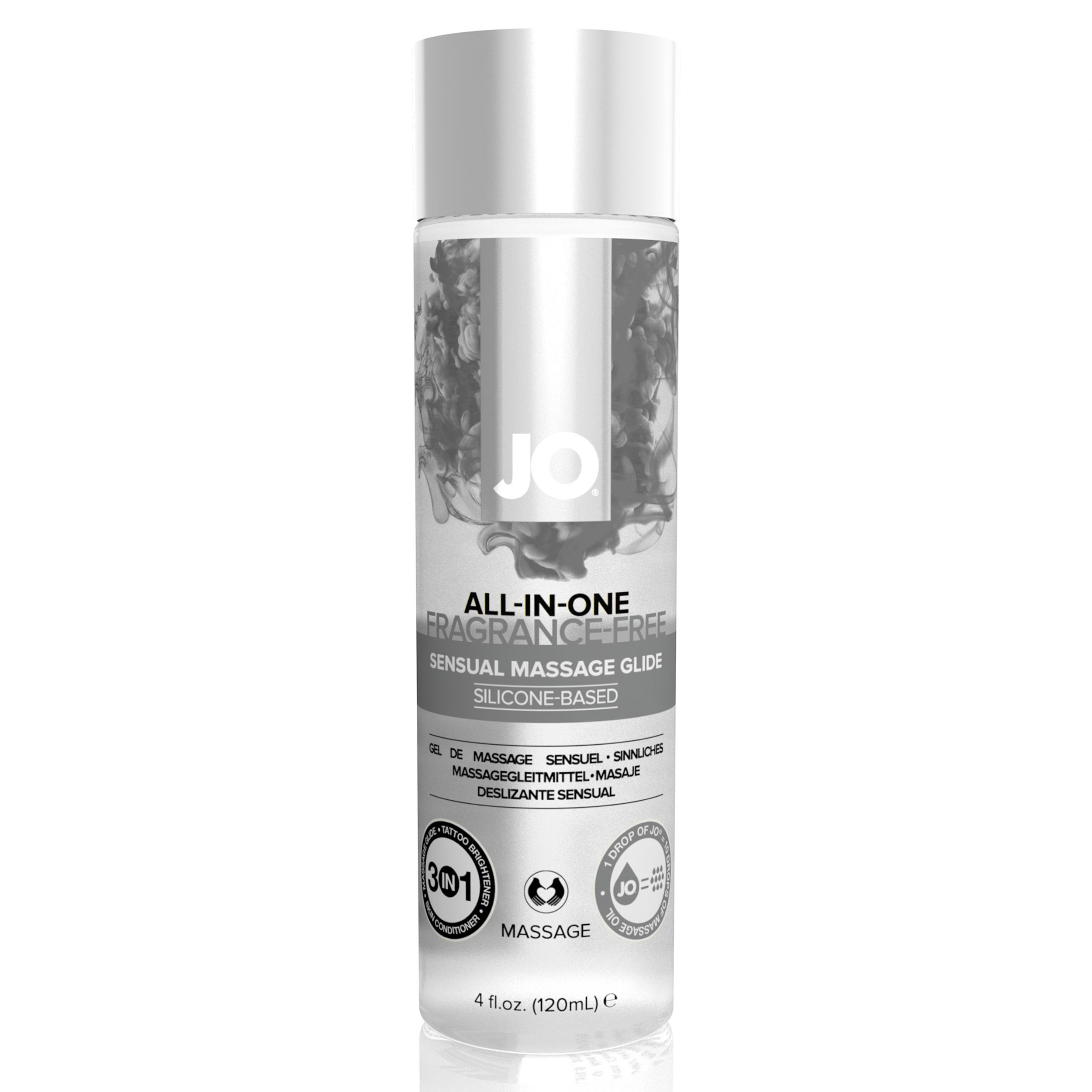 JO All-in-One Massage Lubricant е масажен лубрикант на силиконова основа, който действа и като изсветлител за татуировки и балсам за кожа. Формулирана само с най-висококачествени силикони, тази продуктова колекция предлага невероятно усещане. Копринено гладкото плъзгане го прави идеален спътник за почти безпроблемен масаж на цялото тяло. Съставки: Диметикон, Диметиконол