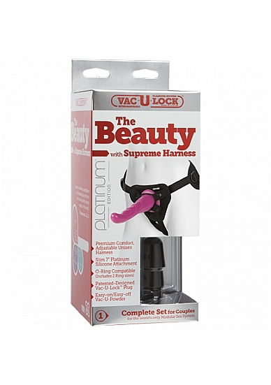 Everything you need for amazing strap-on sex in one box! This set includes the Vac-U-Lock™ Supreme harness made in stylish neoprene, and is adjustable up to 69.5 inches for a comfortable fit. Combined with the included Platinum Premium Silicone Beauty attachment, you can enjoy rigorous play with just a snap. The curvaceous yet slim Pink Beauty has an insertable length of 7”; it’s 100% phthalate-free platinum silicone and Proudly Made in America. Additionally, each set includes a removable Black Vac-U-Lock plug, two O-rings, powder, and an instructional brochure. All Vac-U-Lock products are interchangeable; the harness can also be used with all O-ring compatible toys.Specifications:
