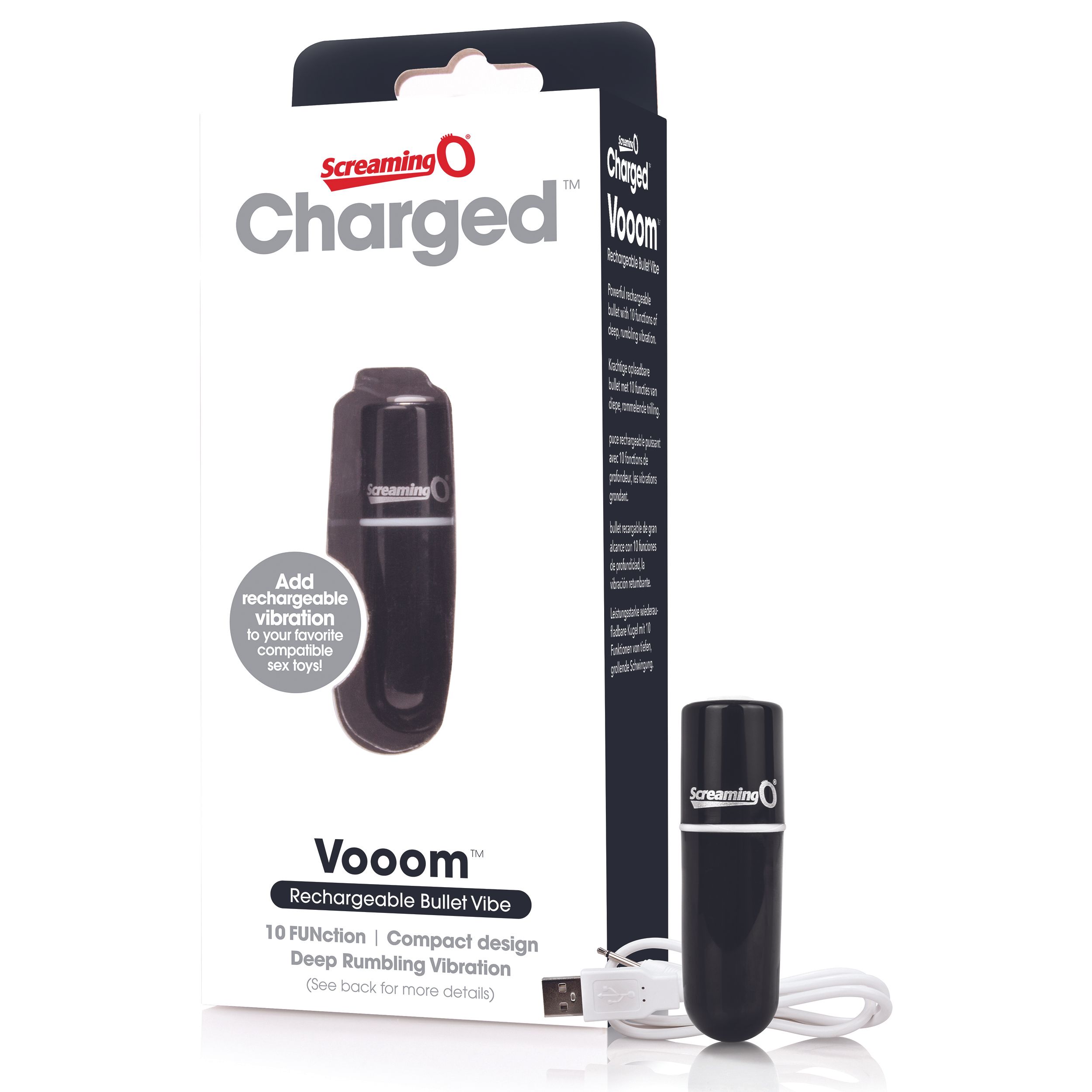 Насладете се на мощна преносима вибрация с Charged Vooom, уникална 100% водоустойчива куршумна вибрация, оборудвана с 10-функционален мотор, който бръмчи с честота, различна от всичко, което някога сте усещали! Вместо традиционно бръмчене, тази нова технология гърми дълбоко за проникващо удоволствие и драматично различно усещане, на което можете да се насладите почти навсякъде! Неговата елегантна форма означава, че може да пасне и на повечето съществуващи продукти на Screaming O и да им даде интензивен тласък на мощността. При най-високата си скорост, Charged Vooom вибрира повече от 60 минути и се презарежда лесно с удобен USB конектор (включен), който се включва сигурно и остава включен по време на зареждането – безпроблемно зареждане в най-добрия си вид! Charged Vooom се предлага и с 2-годишна ограничена гаранция, така че можете да се насладите на пронизващо удоволствие с увереност. Насладете се на Charged Vooom самостоятелно или го използвайте, за да добавите мощна ръмжаща вибрация към любимите си съвместими интимни аксесоари!