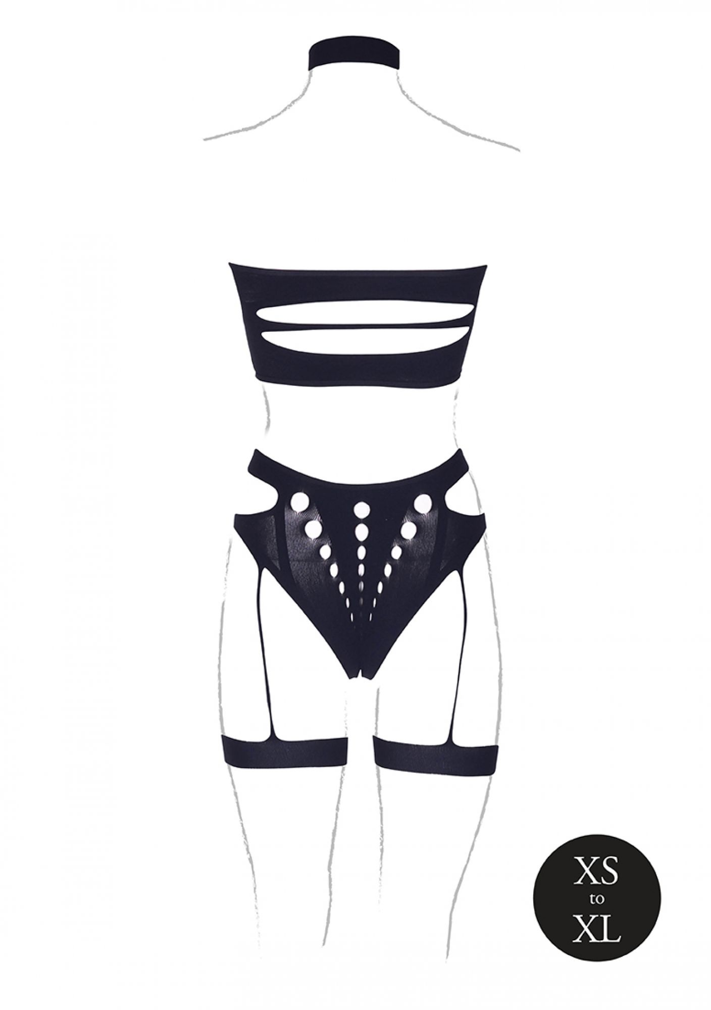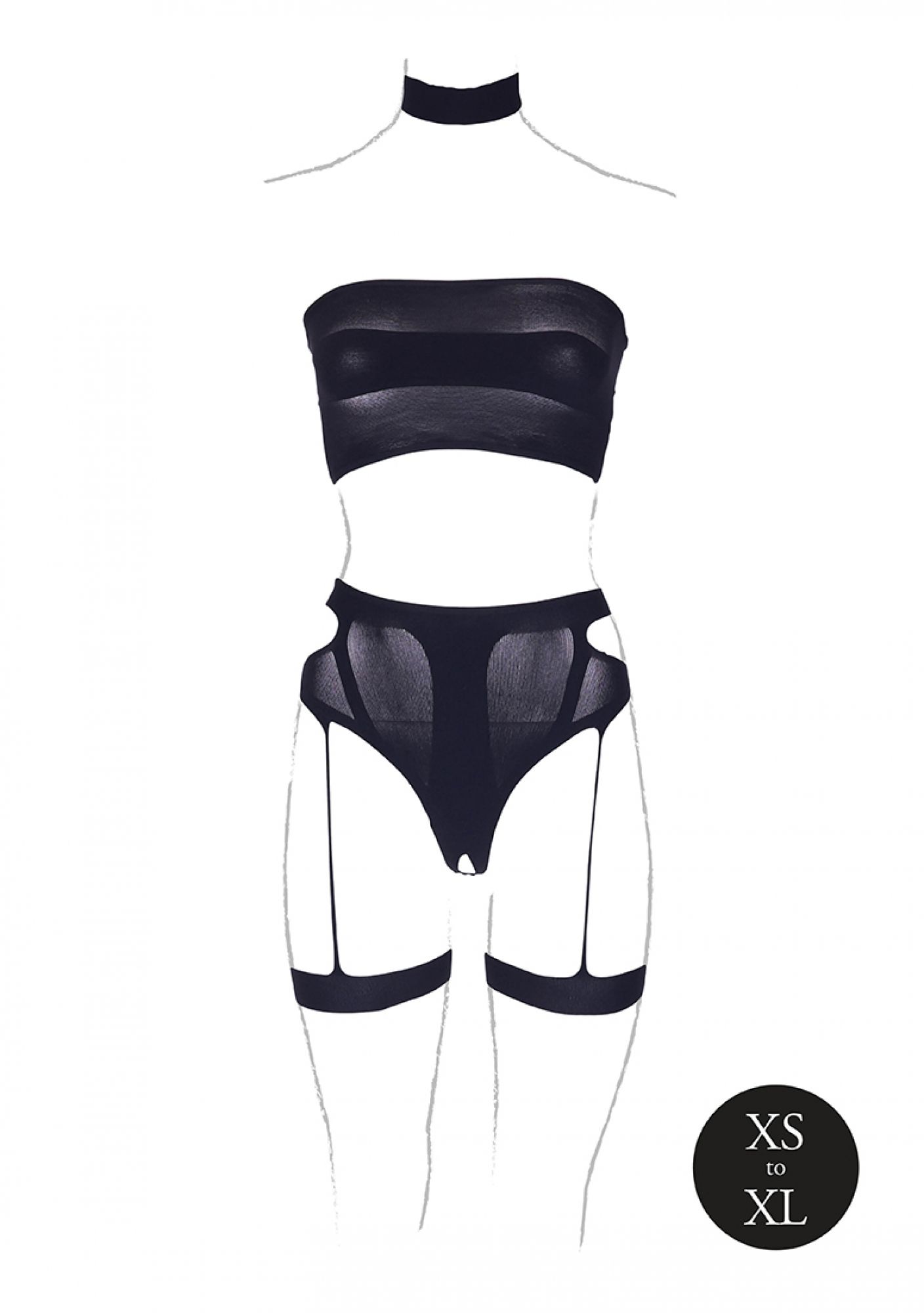 Осмелете се да бъдете различни с този невероятен комплект от три части. Комплектът включва удобно прилепващо бельо с жартиери, полупрозрачен бандо и чокър, който завършва визията. Всички материали са с най-високо качество и еластични. Чувствайте се женствени и излъчвайте увереност в този красив комплект от три части.