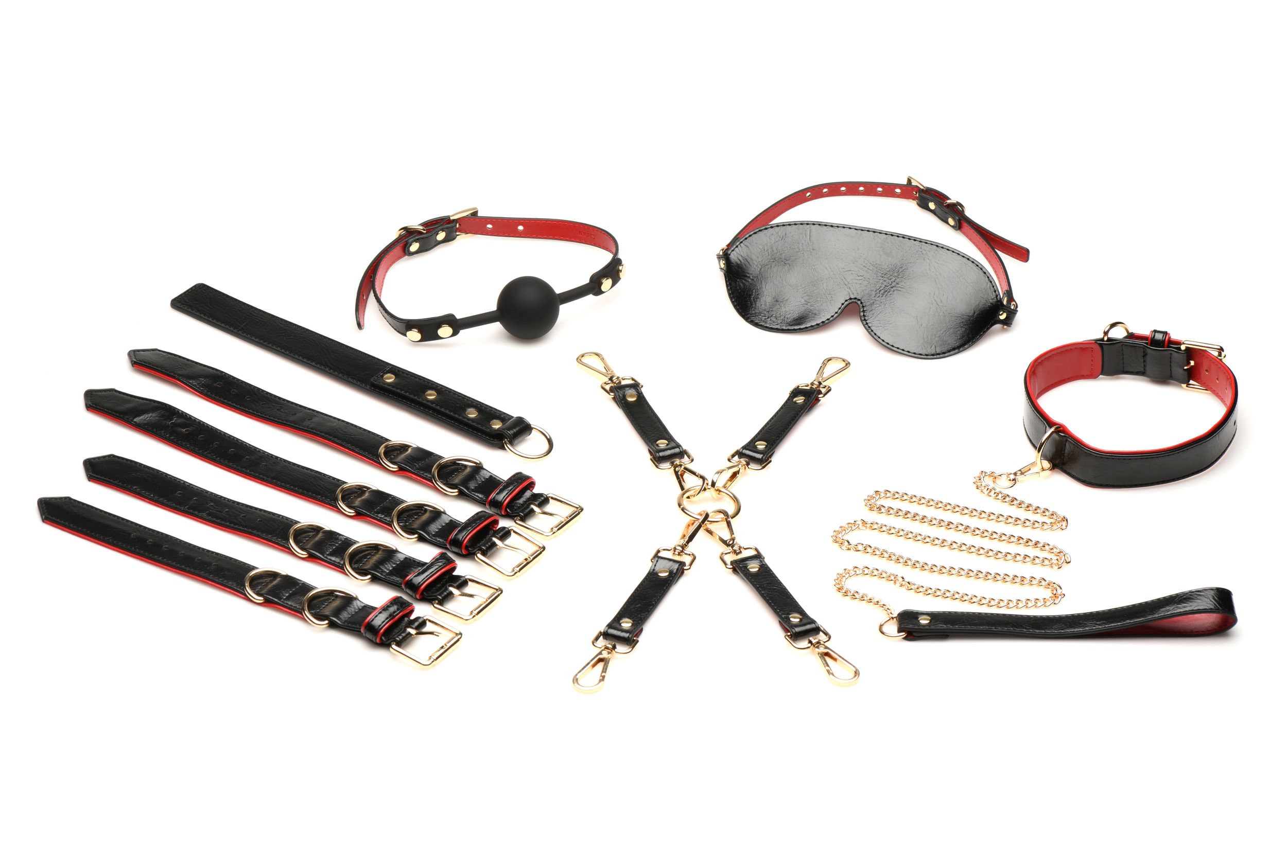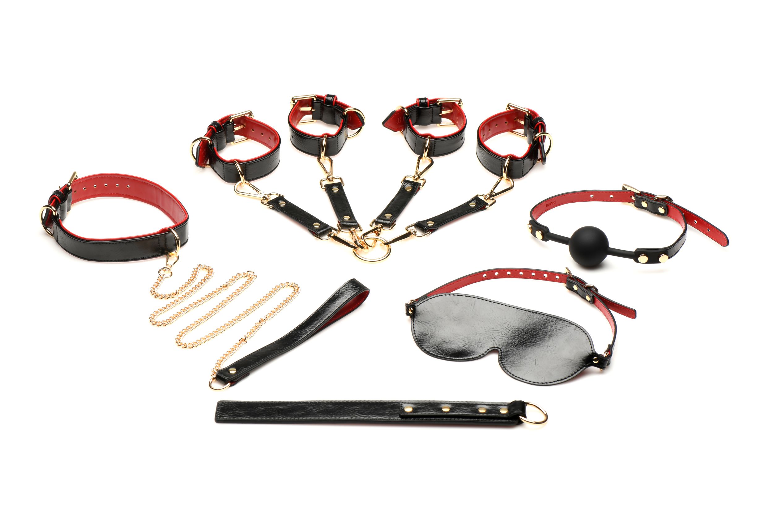 Този комплект е подбран с грижа и внимание към детайла, предлагайки всичко необходимо, за да осъществите най-съкровените си желания. Оставете се да бъдете завладени от удоволствието от превръзката на очите, стимулираща сетивата ви, докато се отдавате на непознатото. Усетете вълнението от топката за уста, която ви кара да се насладите на всяко усещане в тишина. Прикрепете елегантния нашийник към врата на любимия/любимата си и поемете контрол над каишката, насочвайки и доминирайки всяко движение. Регулируемите веган кожени презрамки осигуряват перфектно прилягане, позволявайки ви да обвържете сигурно, но удобно партньора си, а металът без никел добавя нотка лукс и издръжливост. Независимо дали сте опитни в света на робството или тепърва започвате своето изследване, този комплект предлага перфектната комбинация от стил, функционалност и чувственост. С този луксозен комплект за робство всяка нощ се превръща в приключение, което да цените и изследвате. Маска за очи: 19 см x 8,9 см; регулируема презрамка от 47 см до 60 см в обиколка. Топка за уста: диаметър на топката 4,2 см; Регулируема презрамка от 41 см до 56 см в обиколка. Нашийник: регулируем от 34,3 см до 41,3 см в обиколка. Каишка: обща дължина 114,3 см. Белезници за китките: регулируеми от 14 см до 19,7 см в обиколка. Белезници за глезените: регулируеми от 17,1 см до 24,8 см в обиколка. Камшик: 27,9 см Д x 3,2 см Ш. Връзките за връзки Hogtie са с дължина 19 см (включително щипките в двата края).
