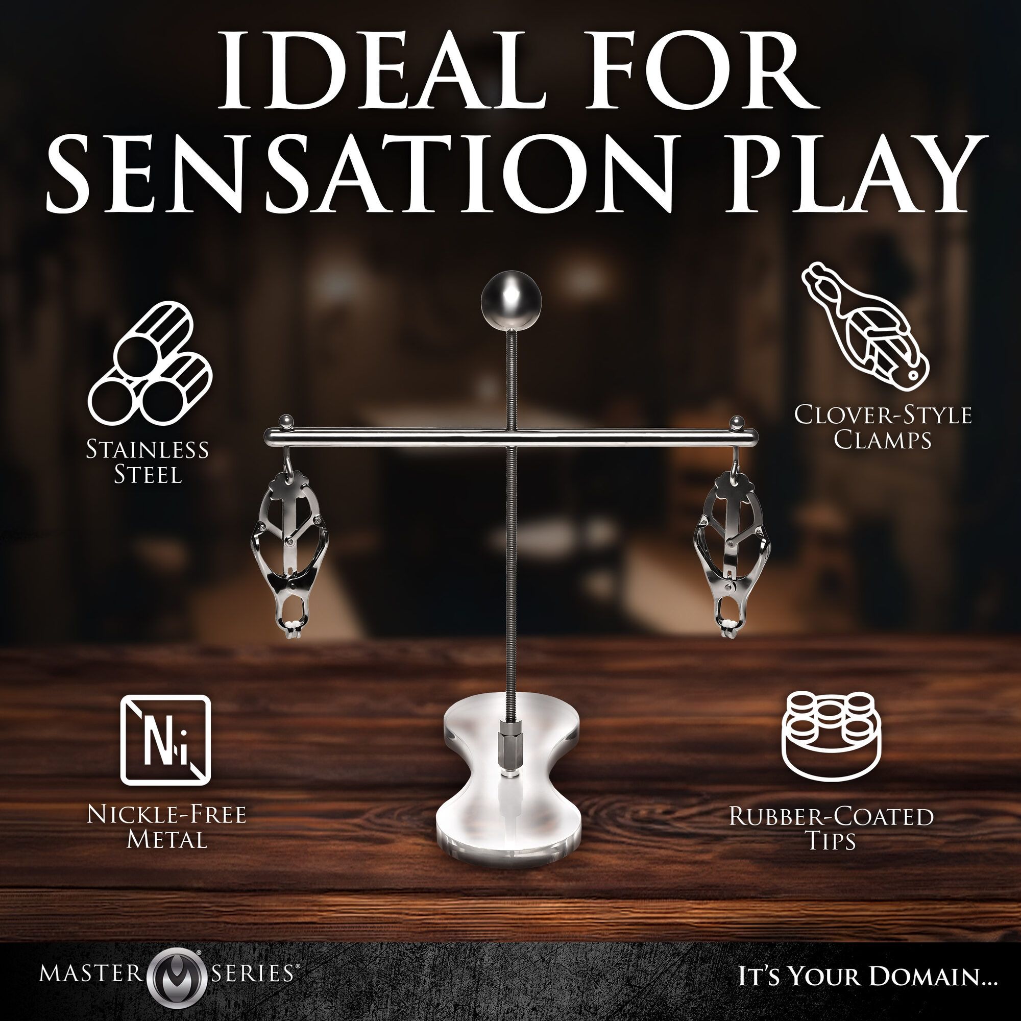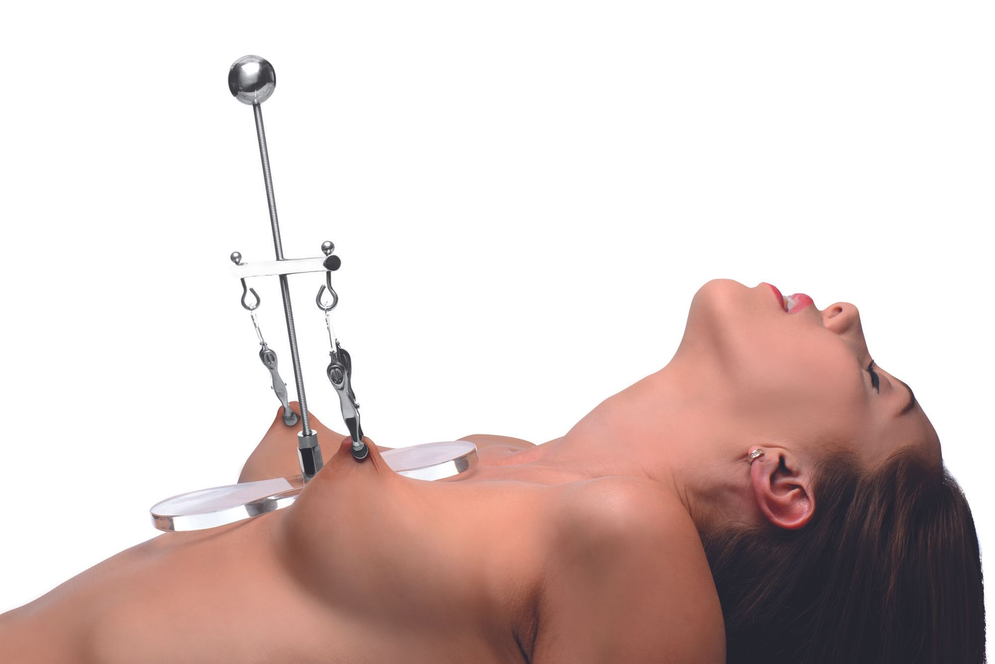 Тази кула е снабдена със скоби за зърна тип детелина, които увеличават налягането след затягане. Кулата е регулируема по височина, което ви позволява да намерите перфектната позиция. Изработена от неръждаема стомана и без никел, тя е подходяща и за чувствителна кожа. Прозрачната платформа лежи между зърната на гърдите им като стабилна основа. Комплектът може лесно да се разглоби за съхранение или транспорт и е лесен за почистване с топла вода и препарат за почистване на играчки. Размери: Напълно сглобена: приблизително 28 см (височина) x 25 см (ширина) x 20 см (дълбочина) Регулируема височина: приблизително 21 см Скоби: приблизително 9,1 см (дължина) x 4,1 см (ширина), отворена до приблизително 1,5 см в диаметър