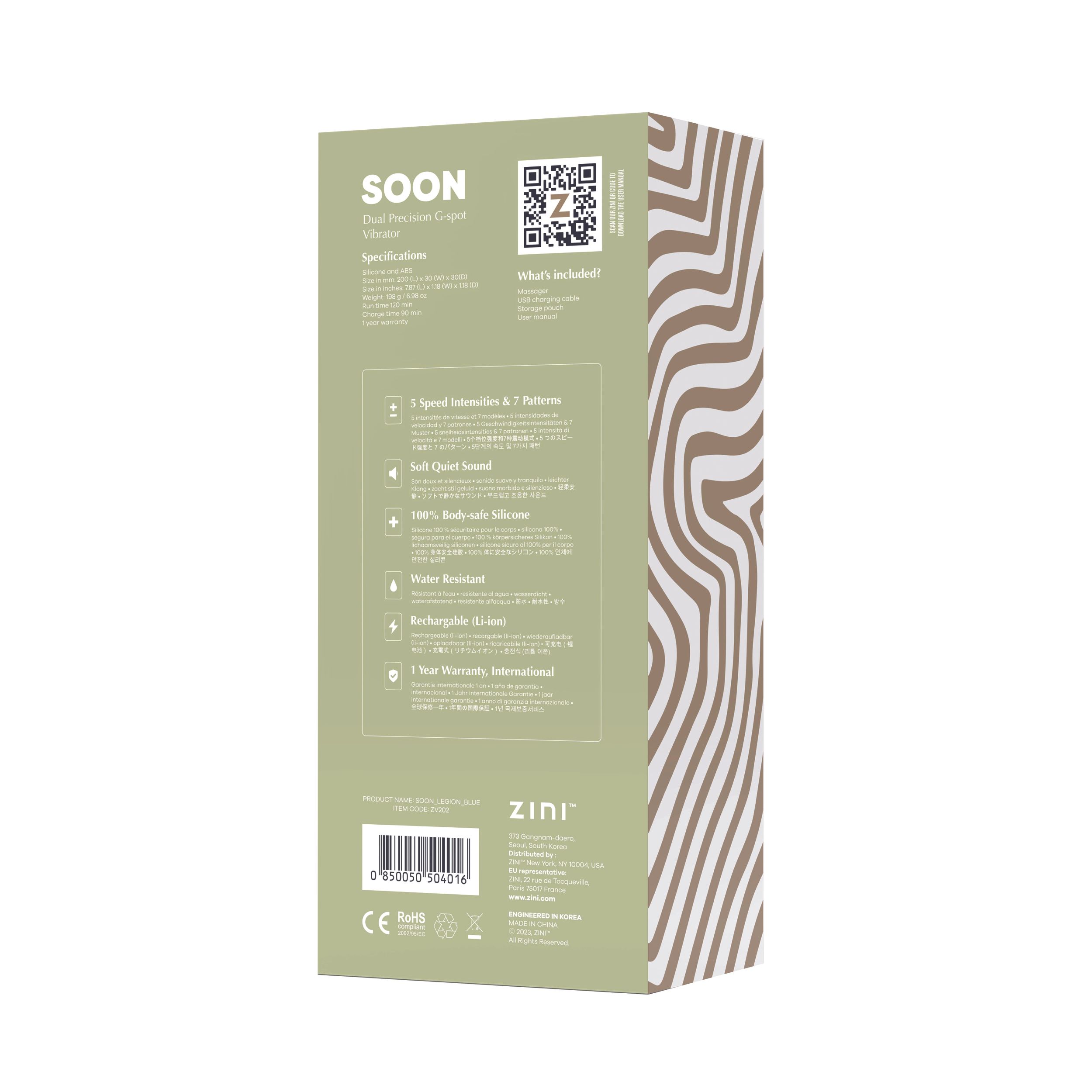 Кажете „Здравейте“ на Soon, вибраторът за G-точката с двойна прецизност, предлагащ изящни удоволствия със специално извитото си тяло, проектирано да стимулира без усилие най-интимните ви зони. Подобрете преживяването си с кадифения, ултрамек силикон на Soon, осигуряващ божествено и отзивчиво докосване. Контурният дизайн, изработен от 100% безопасни за тялото материали, дава приоритет на грижата за себе си, а 5-те скорости на интензитета и 7 модела ви дават пълен контрол над удоволствието. Дискретният звук на Soon гарантира уединение по време на изследване. Прегърнете овластяващата еротика, докато вибрациите му изпълняват най-дълбоките ви желания и изпитайте пълно удовлетворение със Soon, вашият перфектен спътник за себеоткриване и чувствена наслада, водещ ви към царство на копнежното удоволствие. Детайли и акценти: Вибратор за G-точката с двойна прецизност 5 скорости на интензитета 7 модела Мек тих звук 100% безопасен за тялото силикон + ABS Водоустойчив Акумулаторен (Li-ion), USB калъф за съхранение
